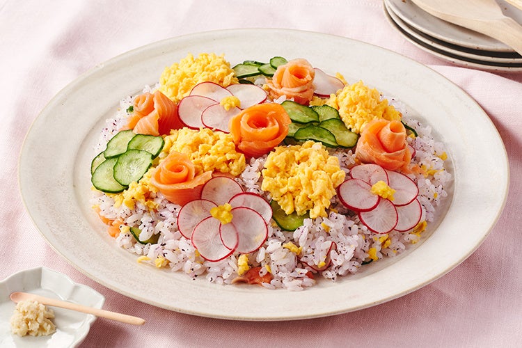 赤しその風味がポイントの酢飯に、食感の良い野菜や甘いたまご、スモークサーモンがのった彩りちらし寿司。異なる風味でハーモニーが生まれ、お箸が進みます。火を使わないので、お子様とご一緒に料理を楽しむことができます。
