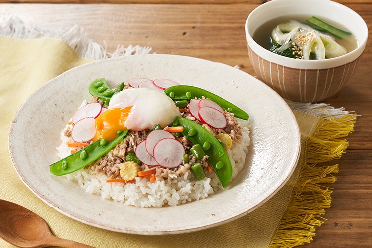 ラディッシュやスナップえんどうの彩りを添えた、春のビビンバ。素材に合わせた下ごしらえで、野菜それぞれの食感が引き立ちます。ごま油香るスープと一緒に、季節の食卓を楽しめます。