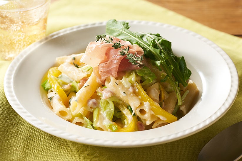 キャベツをペンネと一緒にゆでて、甘さを一層引き立たせました。クリームソースにプロシュートをあしらった、華やぎ溢れるパスタです。
