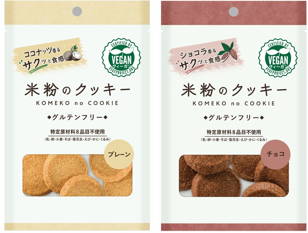 「米粉のクッキー」は国産米粉や北海道産のてんさい糖をはじめ、厳選した素材を使用しております。素材本来のおいしさを味わえるクッキーで、味はプレーンとチョコの2種類あります。仕事の合間やおやつタイムにぴったりな、プラントベースかつグルテンフリーのクッキーです。ぜひ一度ご賞味ください。