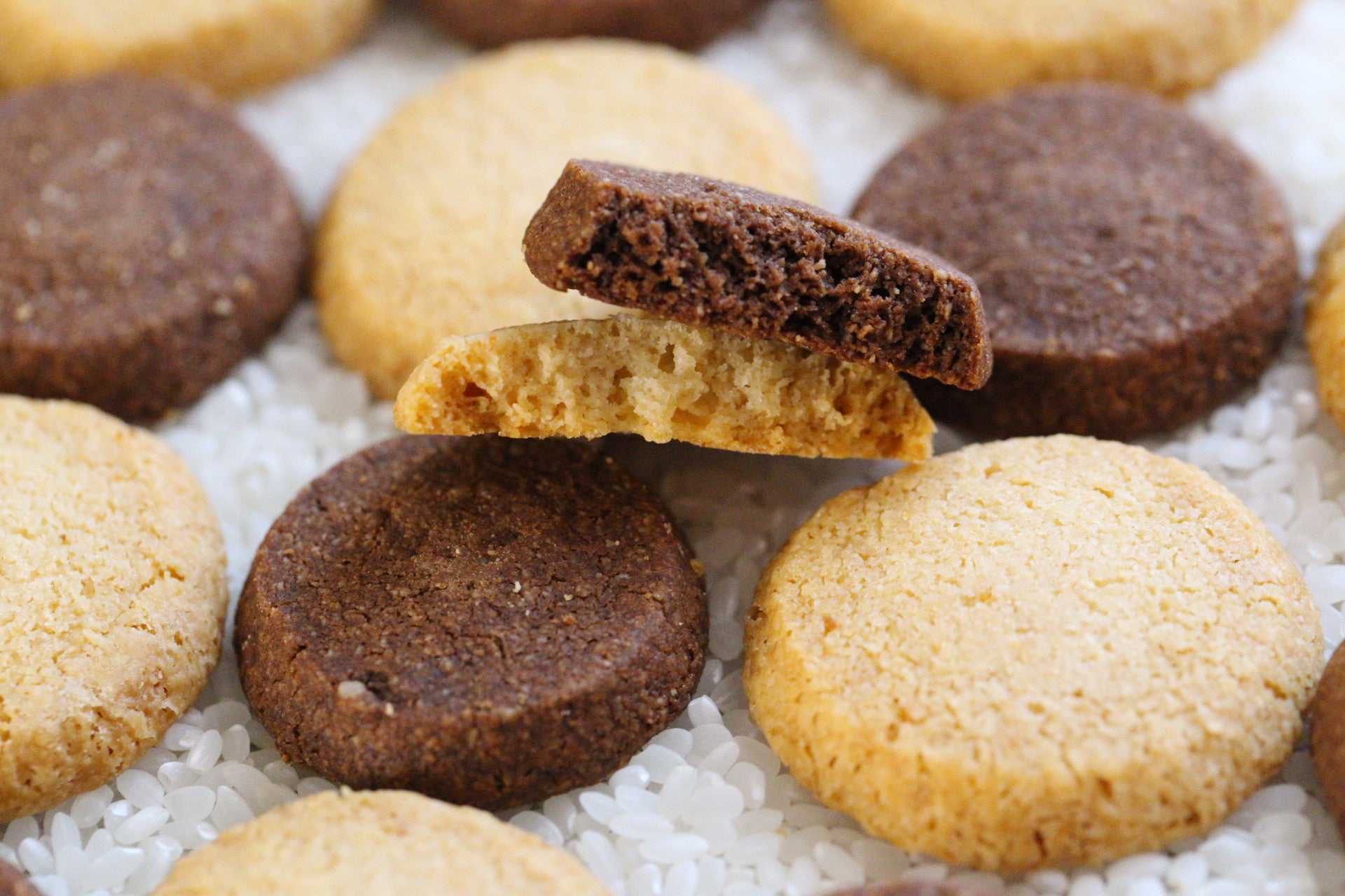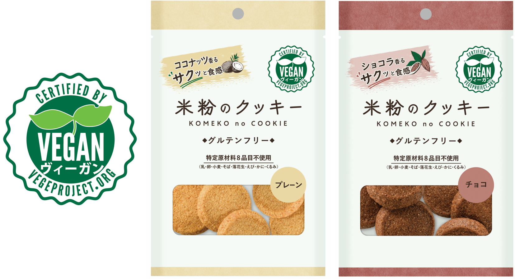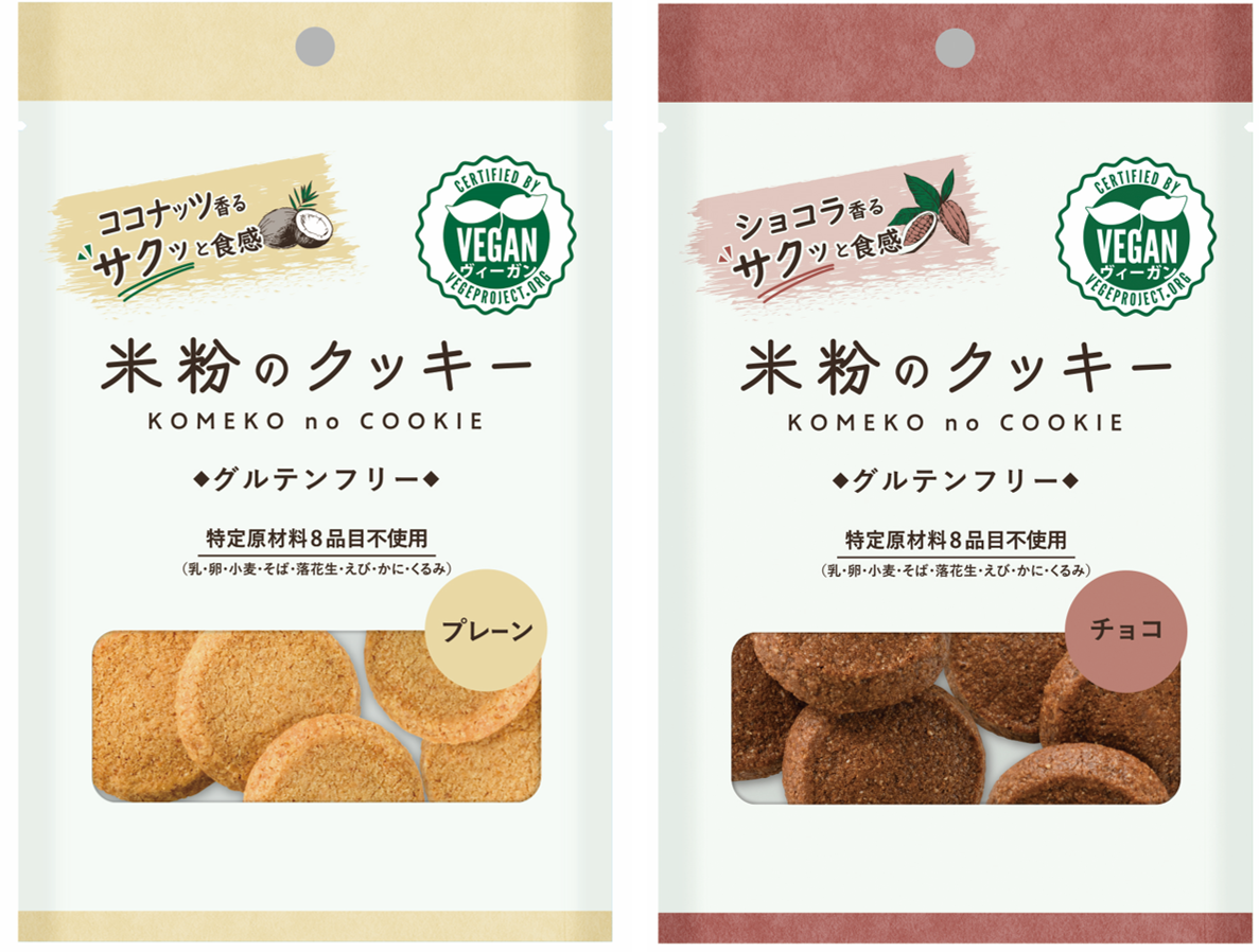 「米粉のクッキー」は国産米粉や北海道産のてんさい糖をはじめ、厳選した素材を使用しております。素材本来のおいしさを味わえるクッキーで、味はプレーンとチョコの2種類あります。仕事の合間やおやつタイムにぴったりな、プラントベースかつグルテンフリーのクッキーです。ぜひ一度ご賞味ください。