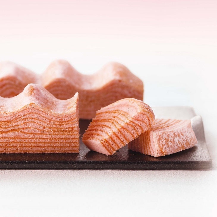 国産の桜葉を練り込んで一層一層焼きあげた桜色のバームクーヘン。