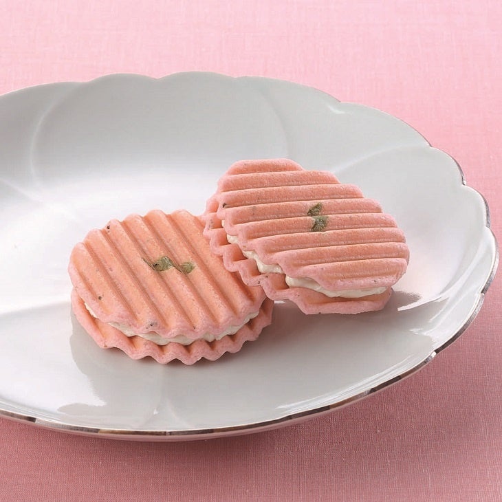 桜葉を練り込んだ歯ざわりの良い桜色の生地で、桜風味のクリームを挟みました。