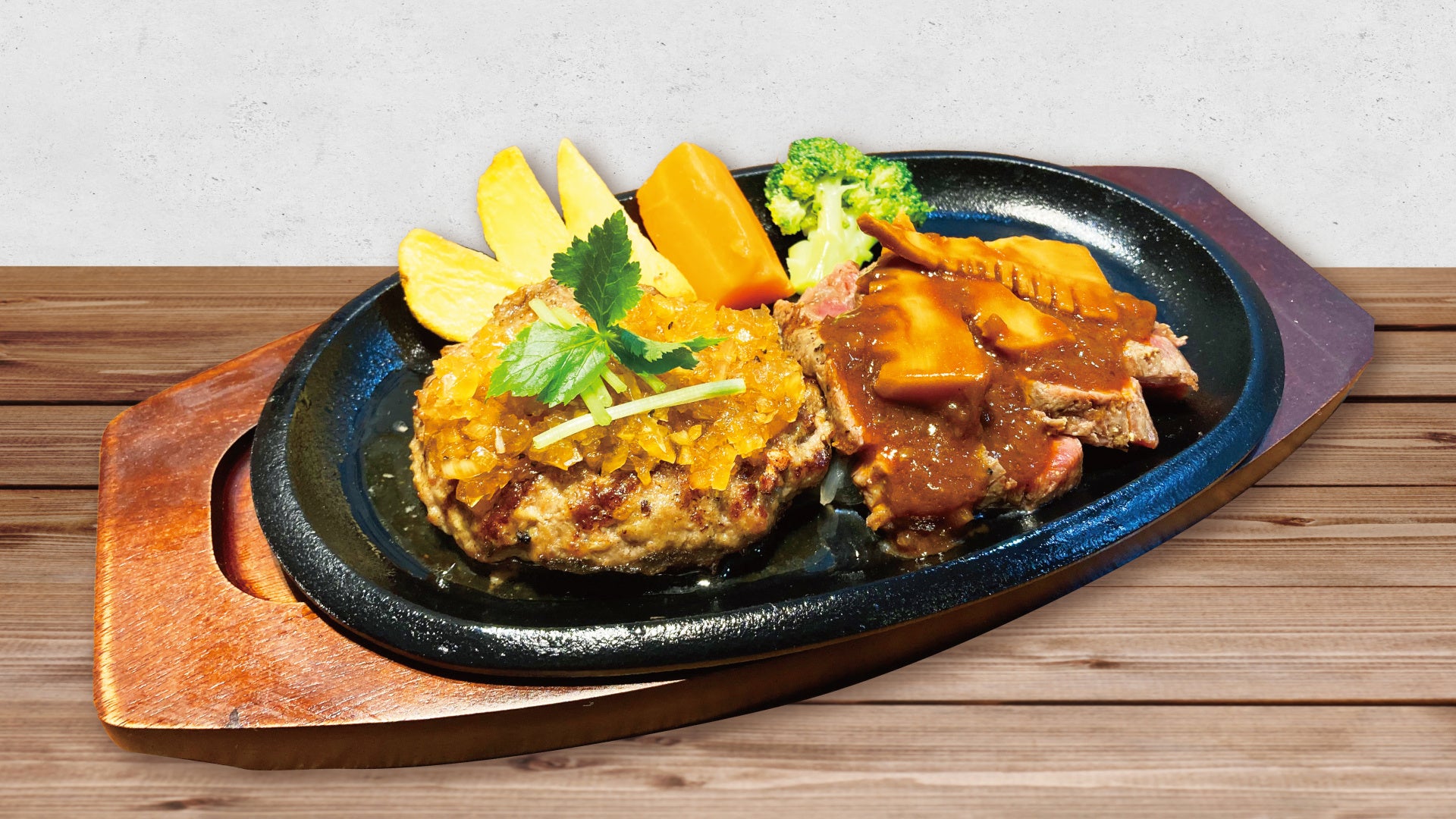 ■国産牛100%ハンバーグ[オニオンソース]&牛ロースカットステーキ[シャリアピンソース]