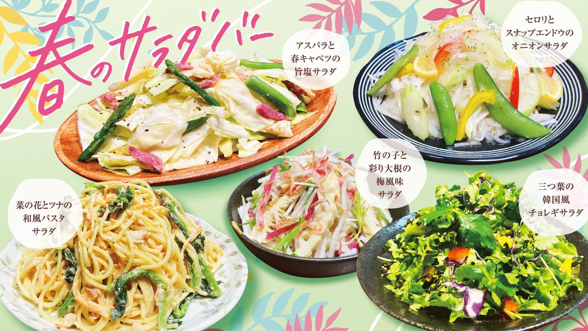 内容:アスパラと春キャベツの旨塩サラダ/セロリとスナップエンドウのオニオンサラダ/菜の花とツナの和風サラダパスタ/竹の子と彩り大根の梅風味サラダ/三つ葉の韓国風チョレギサラダ