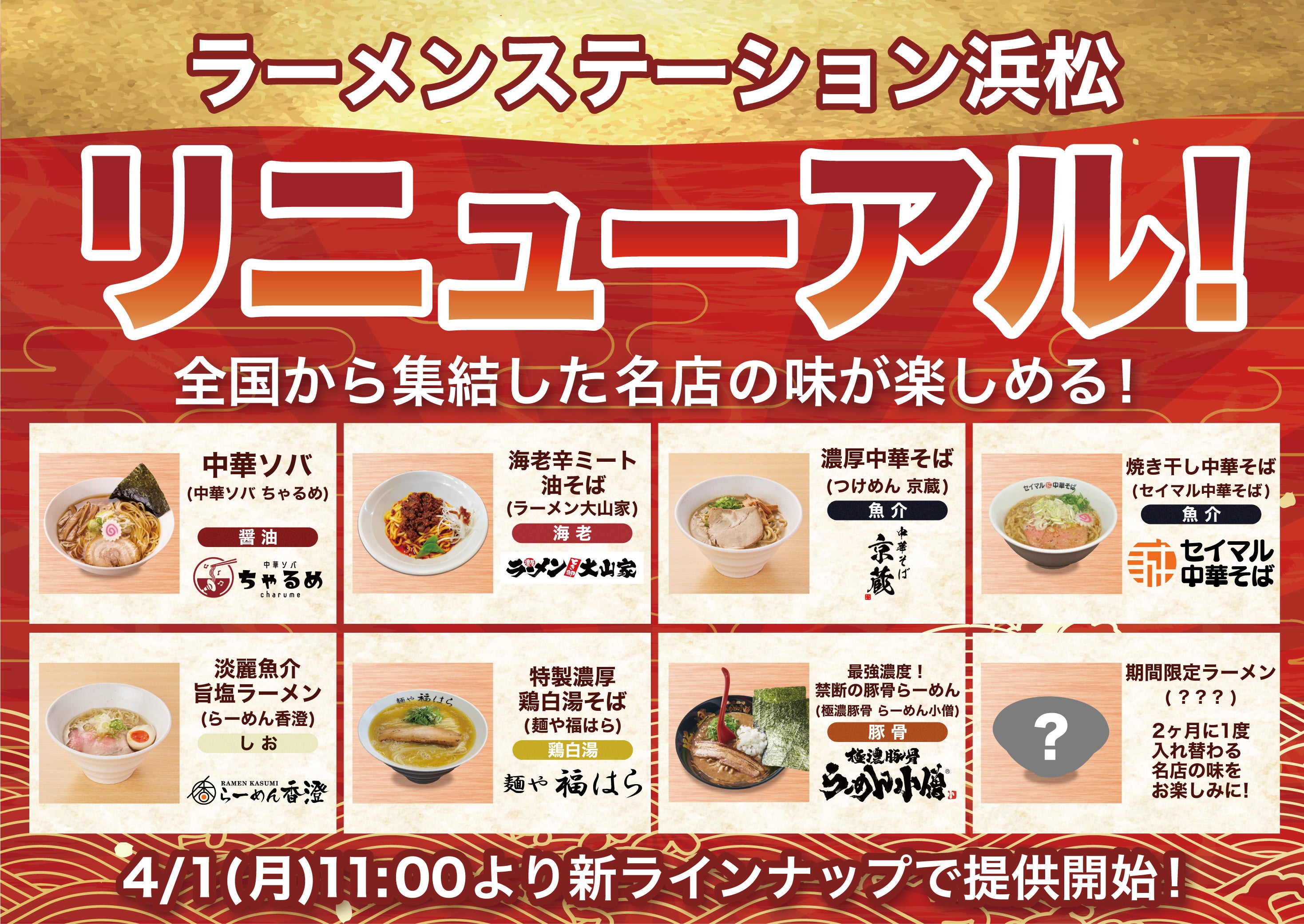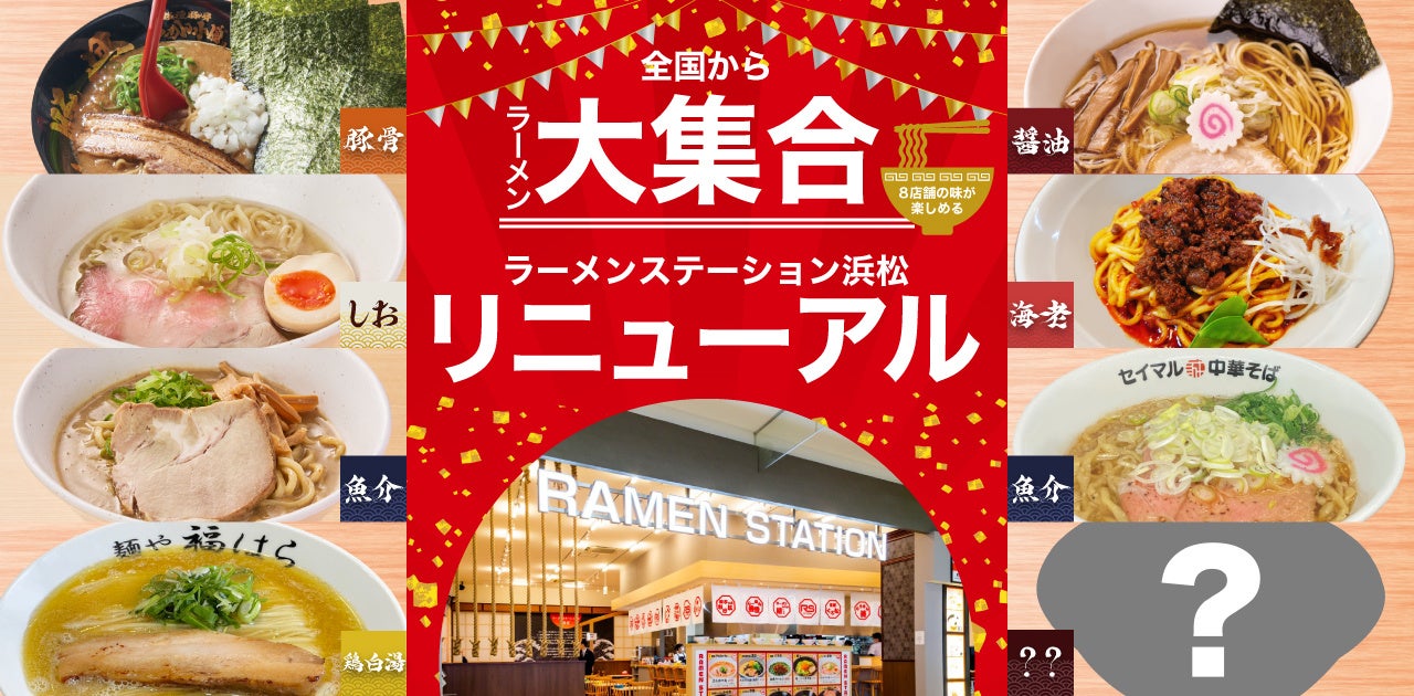 2024年4月1日(月)に、静岡県内ではなかなか味わえない、関西・関東から集まったラーメン店8店舗の味をいつでも楽しむことができる、ラーメンステーション浜松のメニューが大幅に入れ替わります。今回の入れ替わりからは8店舗のうち7店舗を常設とし、1店舗は路面店型と同様に2ヶ月に1度の周期で入れ替わるシステムを導入いたしました。