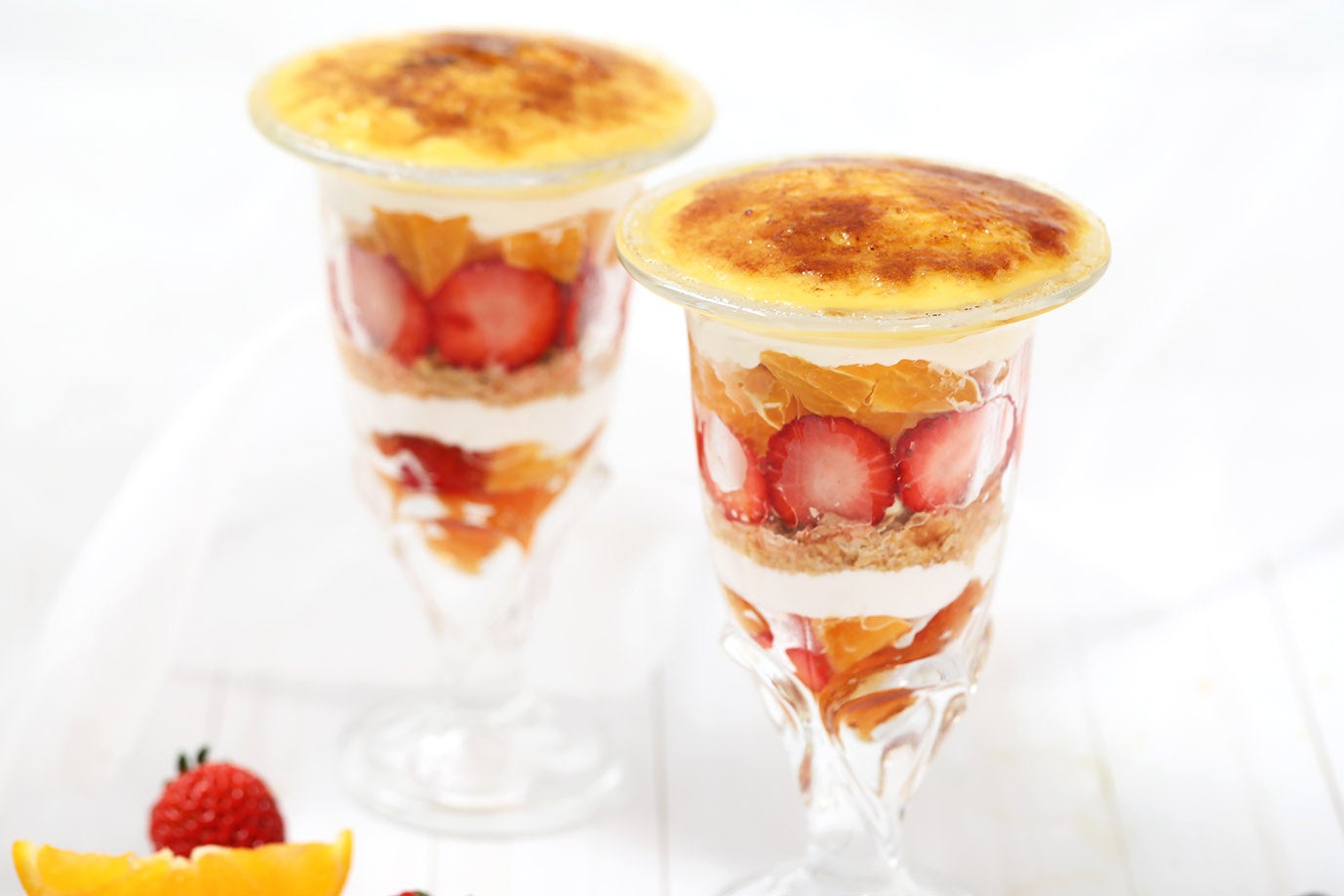 こ だ わ り:季節ごとにお楽しみいただけるブリュレパフェに、みずみずしいデコポンと甘酸っぱい苺を使用しま
