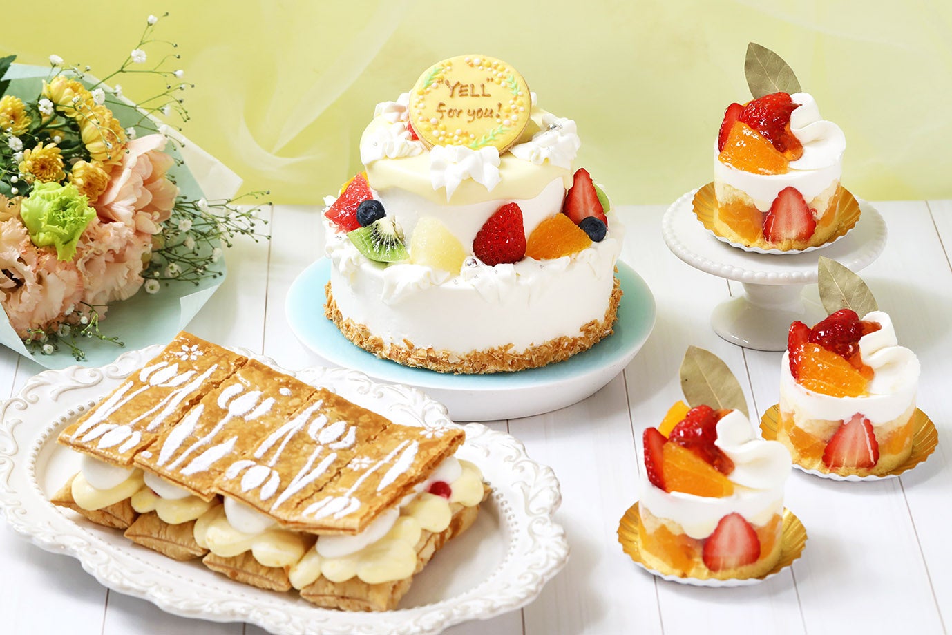 「ピネード」自慢の2段ケーキに、事前のご予約で“応援(エール)”のメッセージを入れたアイシングクッキーをお付けする『夢の2段ケーキ YELL〜エール〜』、昨年ご好評いただいた『メロンのショートケーキ プリンセス』、『シャインマスカットのショートケーキ プリンセス』、『りんごのショートケーキ プリンセス』に続き、旬のフルーツとショートケーキを味わう特別感のあるスイーツ『苺とデコポンのショートケーキ プリンセス』、定番人気商品『ミルフィーユ Melody』が春限定でチューリップのイラストをあしらった『ミルフィーユ Melody Spring』をご用意いたしました。