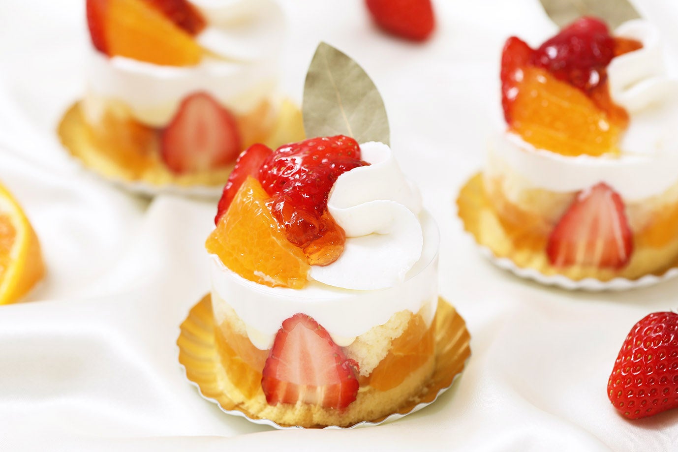 こ だ わ り:苺、キウイ、グレープフルーツ、オレンジ、ブルーベリーなどの色とりどりのフルーツを飾った“応