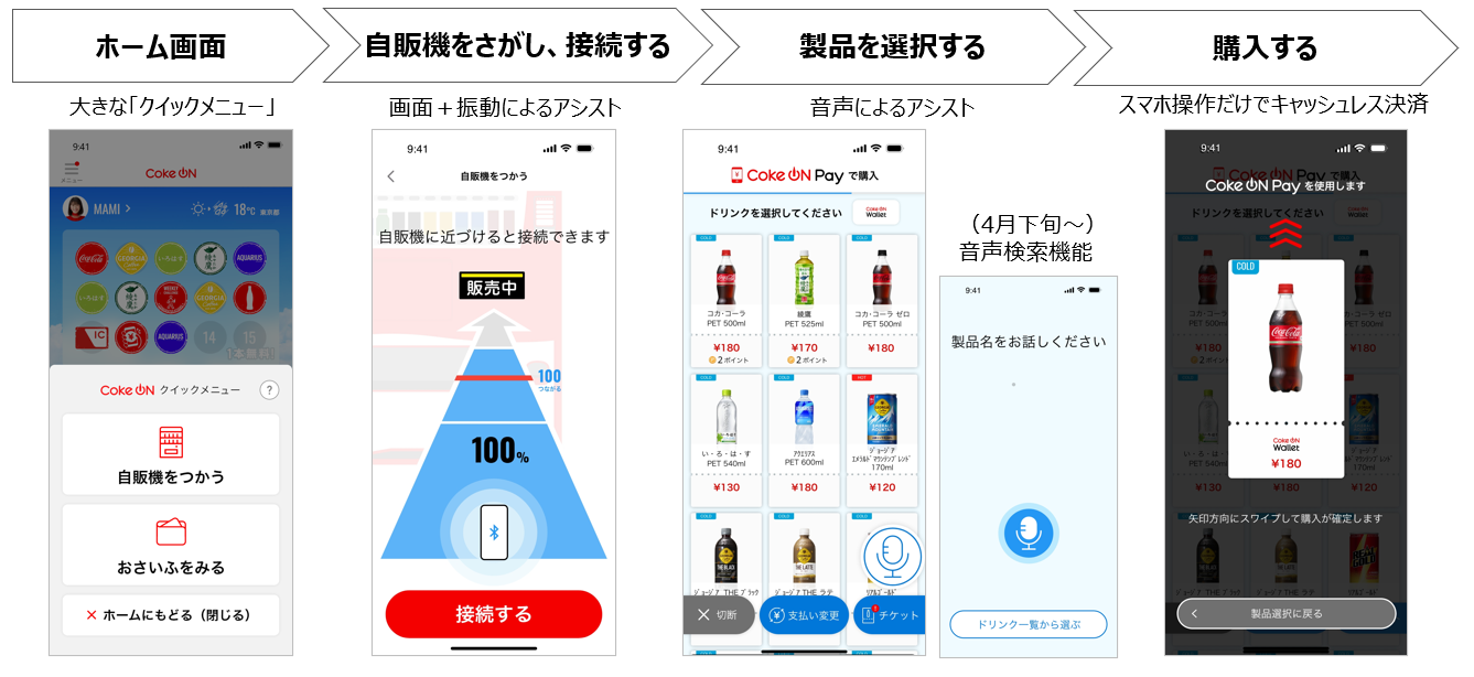 本アップデートは、「Coke ON」の継続的なユニバーサルデザイン対応の一環であり、2018年にスタートした、自動販販売機の高いところにあるボタンに手を伸ばさなくても、手元のスマートフォン操作だけでキャッシュレスでドリンクが買える「Coke ON Pay」、2023年12月に導入した、文字の大きな「クイックメニュー」、スマートフォンのバイブ振動と連動した「近くの自販機を探し、接続する」機能につづき、今回公開したバージョンでは、アプリ内の文字や操作ボタンのサイズを拡大しました。さらに、2024年4月下旬には、音声によって自動販売機内の製品を選択できる機能の追加を予定しており、これらのすべての機能は、スマートフォン本体の音声読み上げ機能と組み合わせることもでき、高齢者、車いすをご利用の方、障がいのある方を含む、多くの方にとっての自動販売機のアクセシビリティを改善することができます。