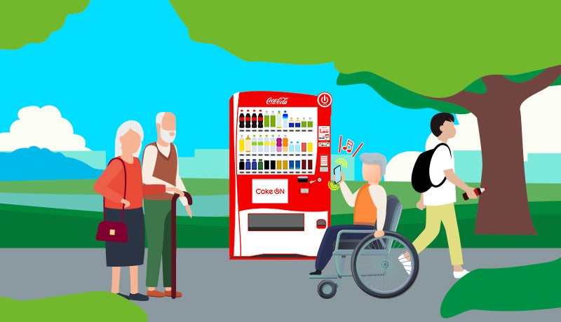 日本のコカ・コーラシステムは、業界に先駆け1991年に中間取出し機(製品の取り出し口を高い位置に配置した機種)を導入するなど、はやくから、自動販売機のユニバーサルデザイン化の推進を率先して進めてまいりました。その後1999年からは日本自動販売機工業会(JVMA/現・日本自動販売システム機会工業会)が中心となり、業界として表記や操作性の統一、コイン投入口などへの点字表示に関するガイドラインを制定。2010年には日本産業規格(JIS規格)によって高齢者・障がいのある方に配慮した設計指針(JIS S 0041:2010 高齢者・障害者配慮設計指針―自動販売機の操作性)も定められました。現在の、コカ・コーラ社のユニバーサルタイプの自動販売機はこれらの業界基準に準拠しています。(※2)2016年の「Coke ON」登場以降は、自動販売機本体の機能だけでなく、スマートフォン側の機能を組み合わせることで、さまざまな方にとっての自動販売機アクセシビリティを改善する取り組みを進めています。