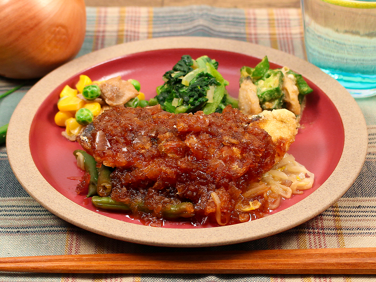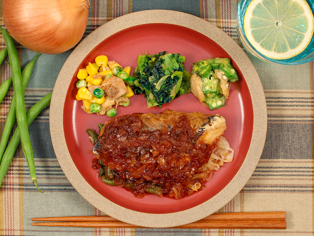 食欲そそる!香ばしく揚げたさばに玉ねぎの甘みを引き立てた香味だれをふんだんにかけました!