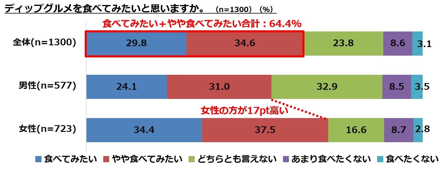 1.食べてみたい人は64%で、男女で約17ptの差あり。