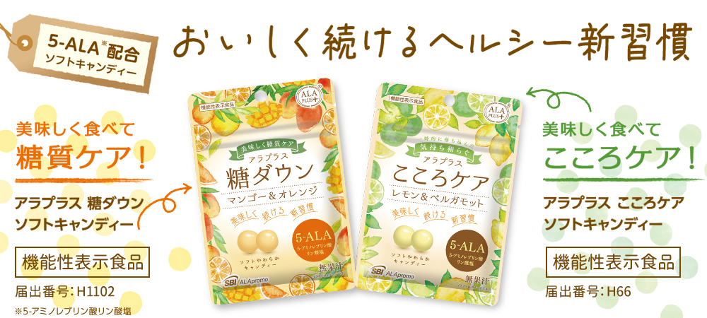 多機能な健康アミノ酸として注目を集めている5-ALA。5-ALAのパイオニアであるSBIグループはより多くの方に5-ALAの魅力をお届けするため、サプリメントが苦手な方でも手軽に日常生活に取り入れていただけるキャンディーやグミ等のお菓子への利用を目指し続けてきました。