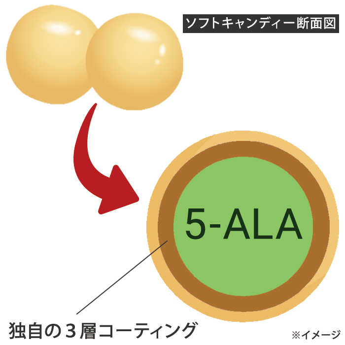試行錯誤を繰り返すこと数年、ガムの製造技術に着想を得て、ついに独自の3層コーティング技術を用いたソフトキャンディーにたどりつきました。これにより、温度や水分に敏感な5-ALAの安定性を維持しながら、フレッシュな味と香りを維持することに成功しました。