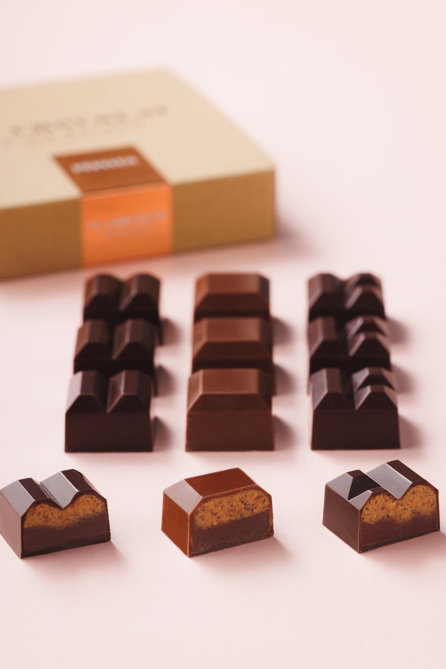 華やかな香りの3種のコフレ・ぺピットが昨年に続き登場!フランボワーズやフレーズ・デ・ボワ(ワイルド・ストロベリー)の果実の豊かな味わいとル・サロンでも人気のクスミティー、テ・ブラン・アラン・デュカス(白茶ベースの華やかな香りのお茶)風味のガナッシュを、アーモンドのプラリネと2層にしてアソートしました。