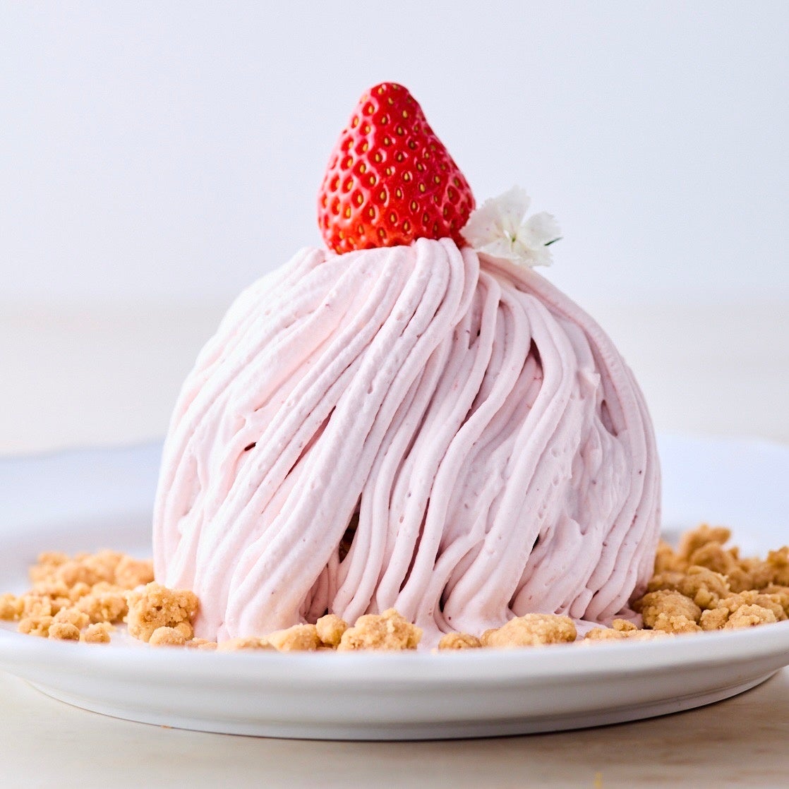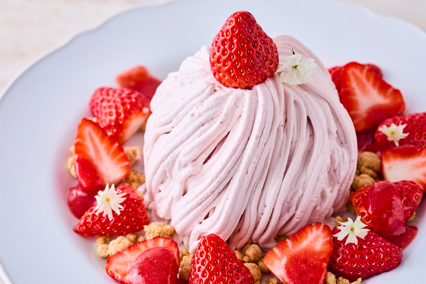 甘くフルーティーな香りのエルダーフラワーを使用した甘酸っぱいストロベリークリームの中に、ストロベリーコンフィチュールを忍ばせ、サクサク食感のクランブルをお皿に散りばめたモンブランパンケーキです。エルダーフラワーティーソースまたはストロベリーソースからお好きなソースをお選びいただき、たっぷりとかけてお召し上がりください。