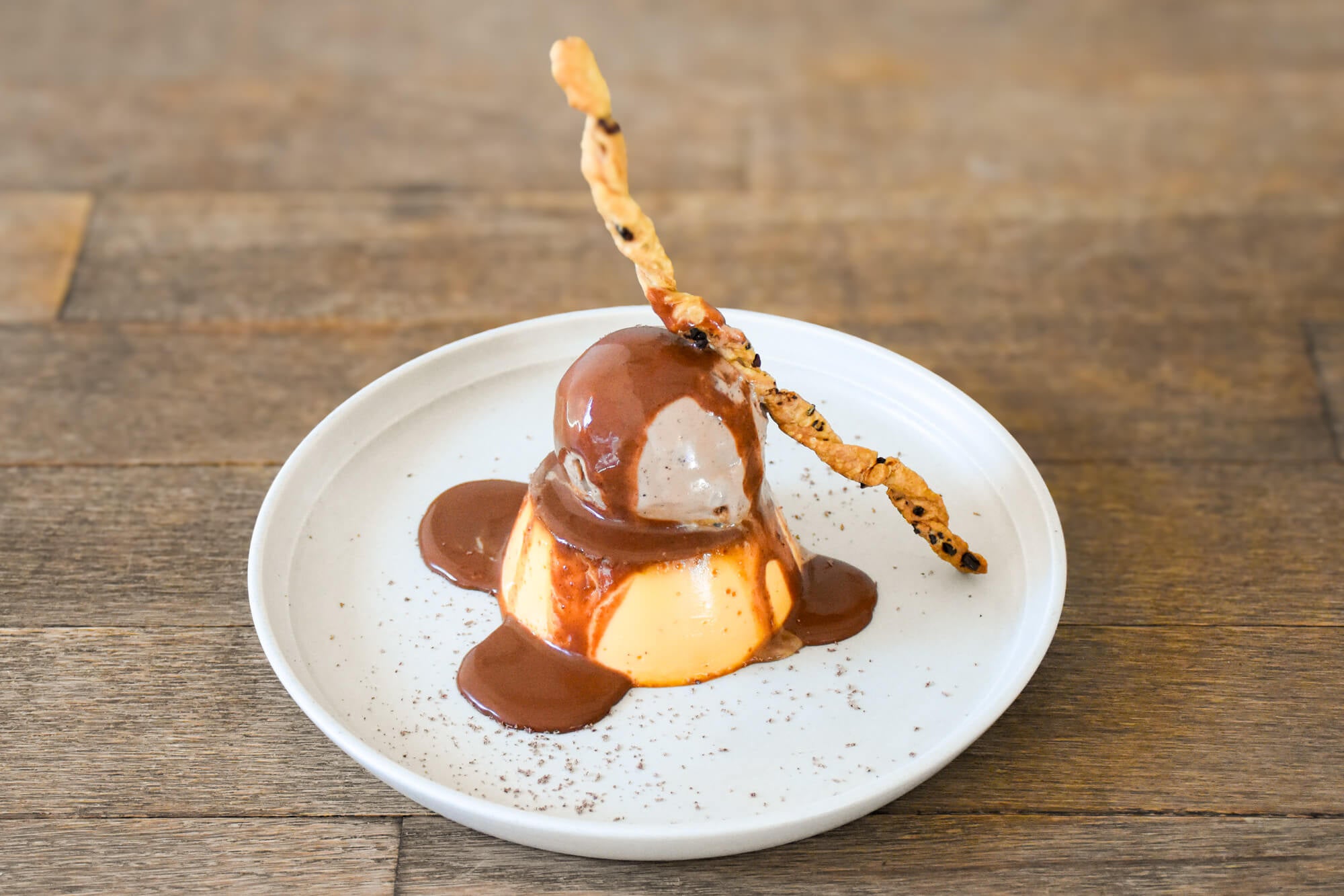 クラシカルプリンに、濃厚チョコレートアイスとチョコレートソースのハーモニー