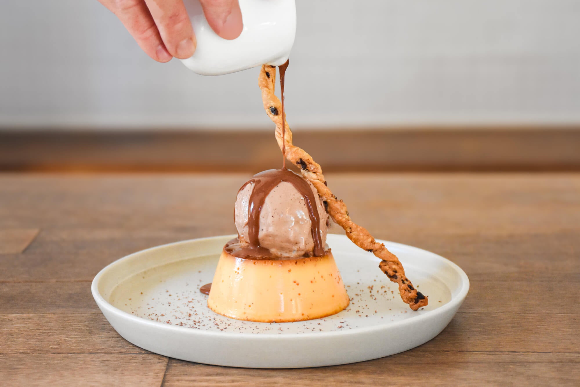 プリンに使っている牛乳にカカオニブで香り付けをすることで、チョコレートアイスやソースとのつながりを持たせ、他のパーツと一緒に食べたときに一体感をもたらします。