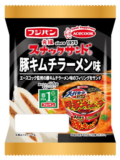 コラボレーションした「スーパーカップ1.5倍 豚キムチラーメン」はポークの旨みを利かせた白湯ベースに、ガーリックや唐辛子を加えた濃厚スープと、豚とキムチを炒めたような香ばしい味わいが特徴のカップラーメン。この味わいをイメージしたスナックサンドを期間限定で発売致します。