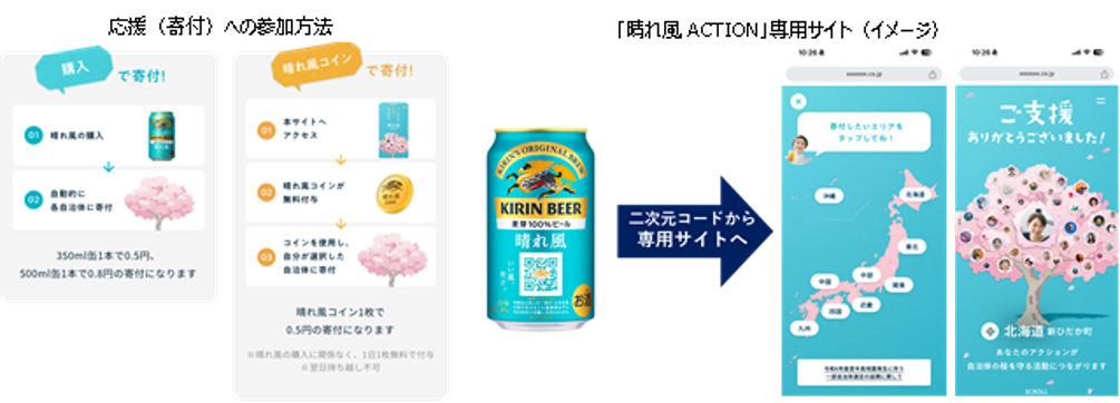 ② また缶の裏に印字された二次元コードなどから専用サイトにアクセスすると、1日1回0.5円分の“晴れ風コイン”が無料で付与され、応援したい自治体を選んで寄付することが可能※5です。