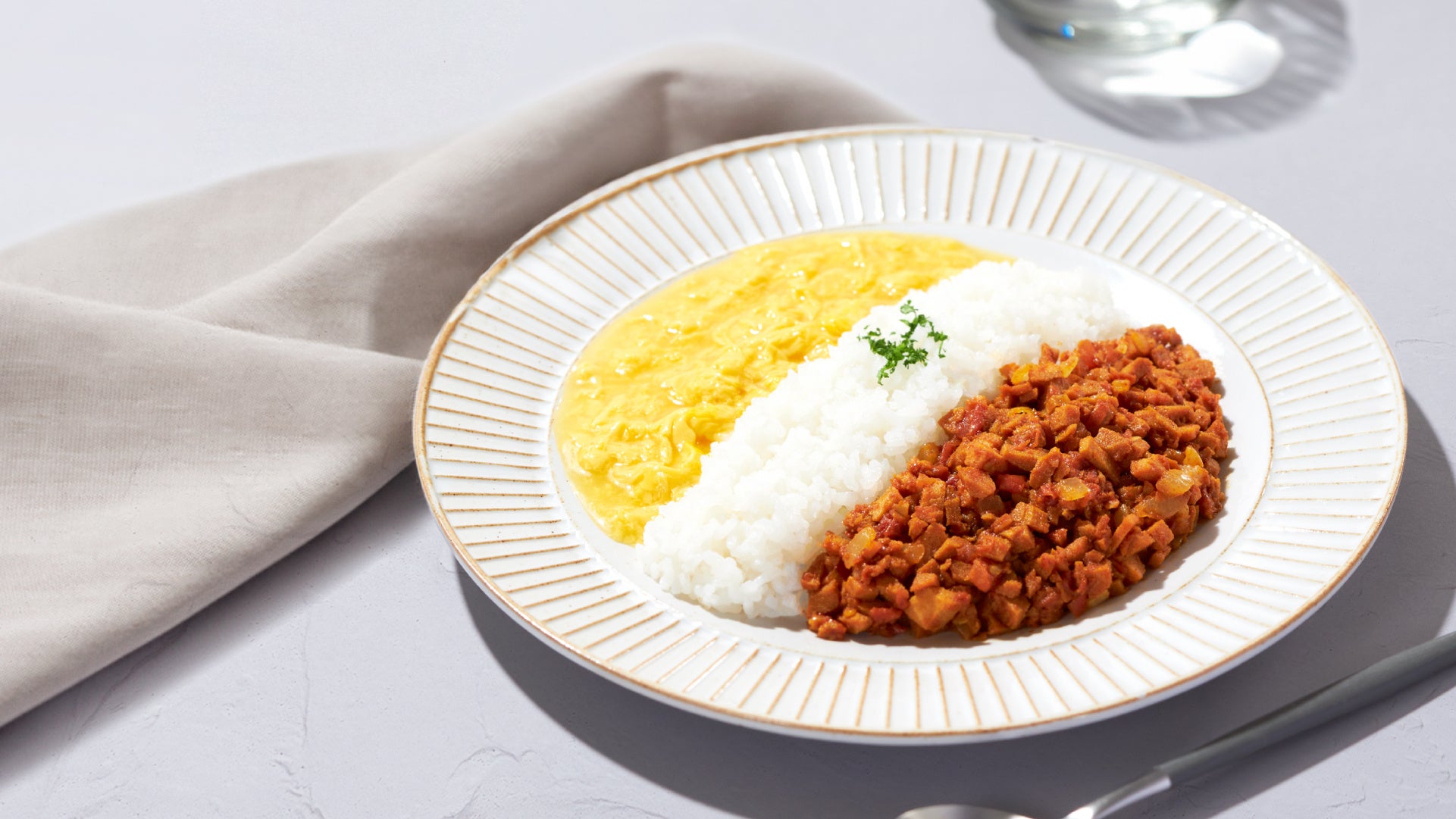 そこで共同開発の第一弾商品として、両社で生み出した新たな独自技術「野菜半熟化製法」(国内特許出願中)を使い、原材料に野菜を使用したプラントベースエッグ「Ever Egg」冷凍タイプを発表。Ever Eggの原材料には、100パターン以上の原材料の組み合わせの中から人参と白いんげん豆を選定し、“ふわとろ”食感を追求しています。