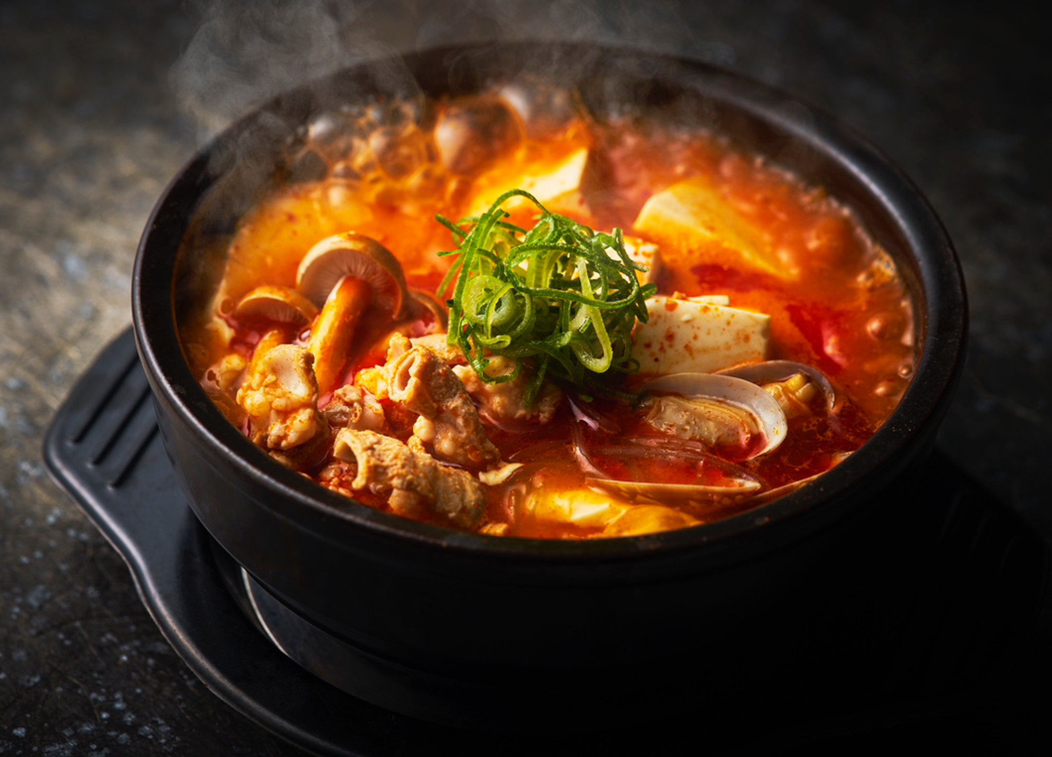 100年受け継がれた伝統のレシピで作り上げる韓丼名物のスン豆腐は、他では食べられない本場韓国の家庭料理の味を再現しています。アツアツの土鍋で、豆腐、アサリ、牛スジ、ホルモン、豚肉などの様々な具材を、唐辛子とニンニクの効いた自家製の調味料で煮込んだ栄養満点で免疫力を高める、女性にも人気の一品です。