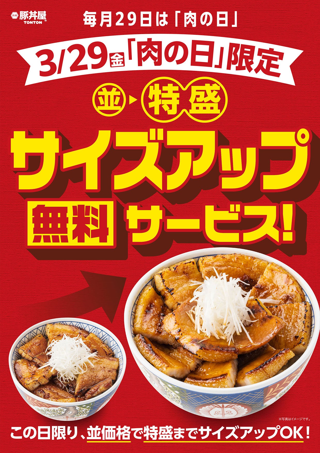 3月はサイズアップ“無料”サービス!並盛価格で特盛までサイズアップ可能。この日限り、お得にお食事いただけます。