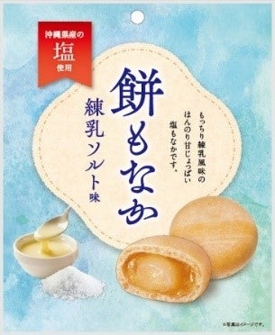 「餅もなか 練乳ソルト味」は練乳と沖縄の塩「ぬちまーす」を餡に練り込んだお餅入りの最中です。練乳の濃厚な甘さと沖縄県産の塩が見事に調和したクセになる味わいです。