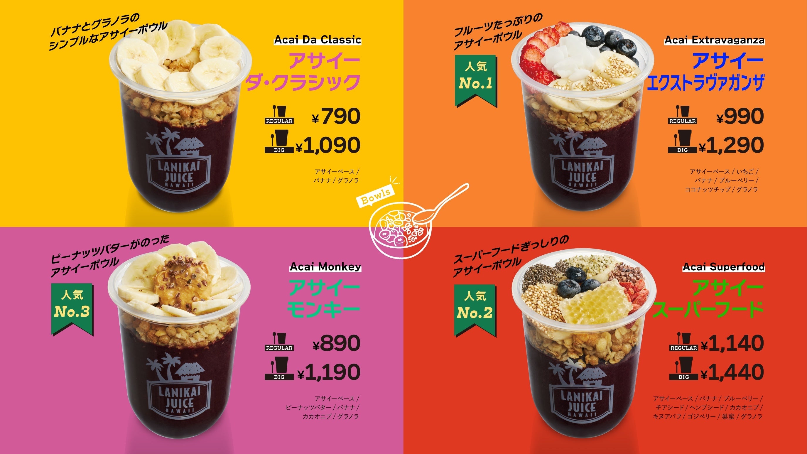 そして驚きなのがその価格。これまでの日本のアサイーボウルはどうしても高価格になりがちでしたが、ラニカイジュースでは「より多くの人にアサイーボウルの味を広めたい」という想いから価格を抑えることに努め、本場ハワイの本店と同じレシピで作ったハワイNo.1アサイーボウルを790円〜というお求めやすい価格で提供します。