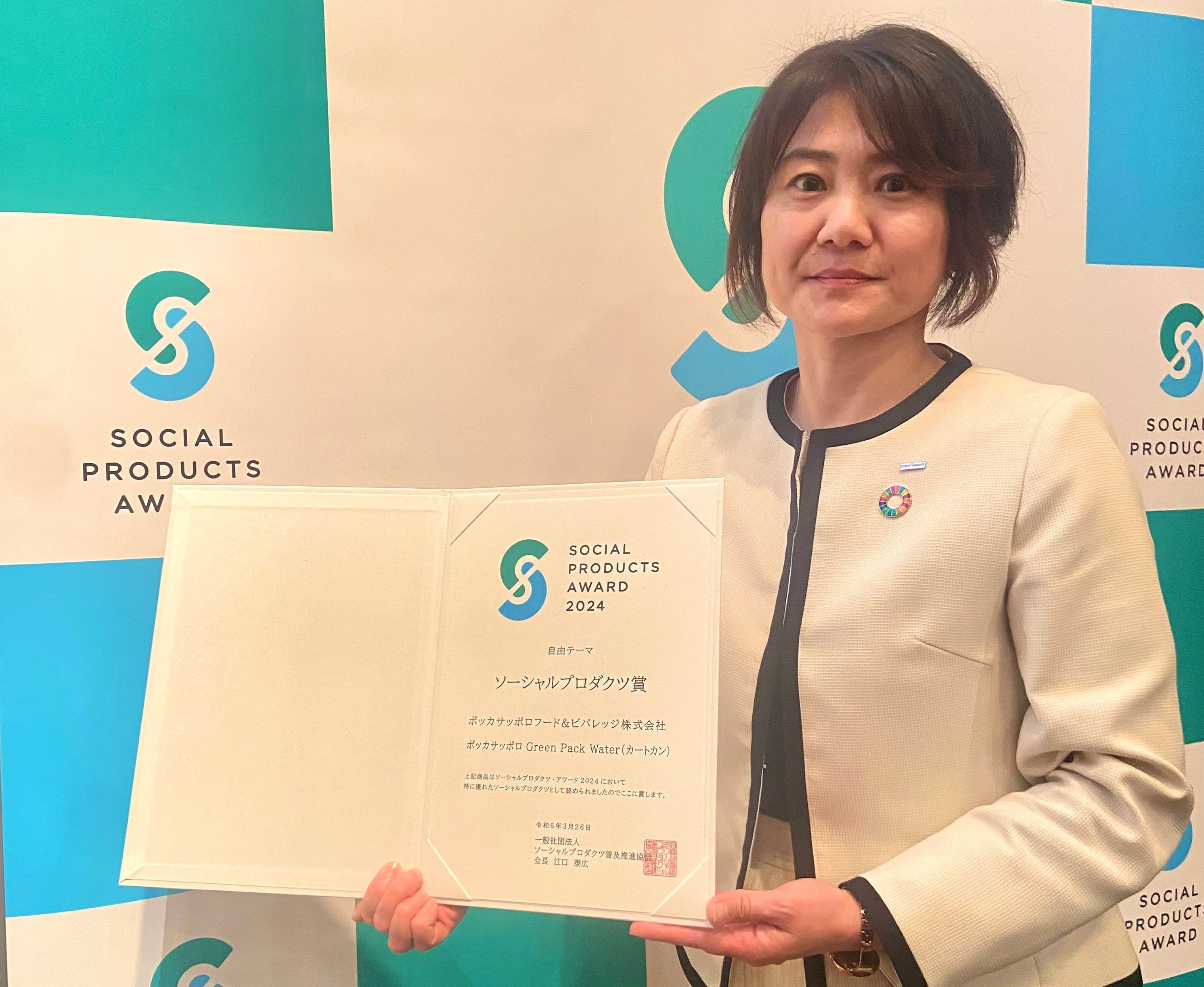 「ソーシャルプロダクツ・アワード」はエコやオーガニック、フェアトレードなど人や地球にやさしい商品・サービスを社会性と商品性の両面を評価する日本ではじめての表彰制度です。自由テーマ※1で受賞した「Green Pack Water」は、紙容器カートカンを採用した水で、国内の森林保全につながる間伐材由来の紙素材を使用している点が評価され受賞に至りました。