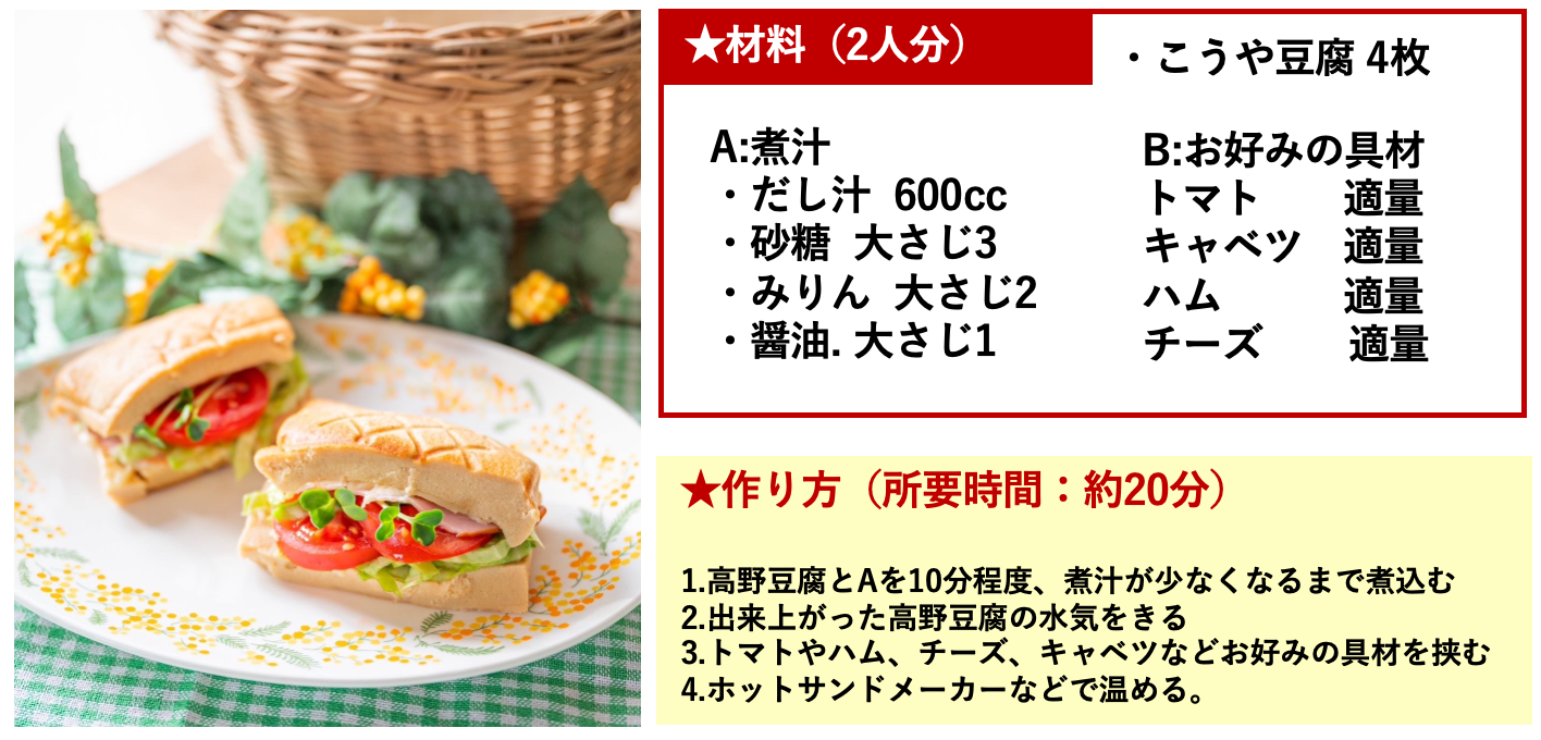 グランプリレシピは、こうや豆腐でホットサンドという斬新なアイデアに加えて「子供が喜ぶ!」「簡単!時短!」項目、味においても高い評価となりました。アイデアレシピは各テーマにおける高い得点に加え、味、家にあるもので作れる手軽さもポイントとなりました。
