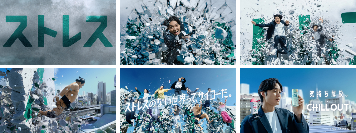 さまざまな作品で等身大の男性の姿を描く役柄が多い俳優・磯村勇斗さんが、体当たりで「ストレス」と書かれた壁をぶち破る爽快ムービーです。このほか誰もが思わず共感してしまう働く大人たちの日常のストレスを題材にしたWEBムービーも同時に展開します。くすっと笑えるお相撲さんバージョンもご用意し「CHILL OUT」ならではの遊び心あふれるムービーに仕上げています。