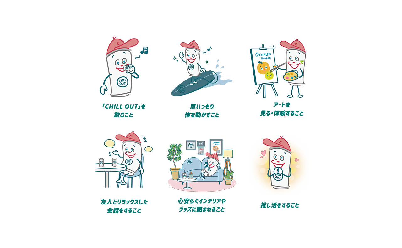 人気のアーティストたちによるオリジナルデザインの「CHILL OUT」がランダムで出てくる「CHILL OUT」オリジナル自動販売機が登場。シティポップ、ファッション、音楽・アニメ、ゲームをテーマに活動するアーティストがストレス解放をテーマに描き下ろした「チルするアート缶」で、ささやかなアート体験をお届けします。