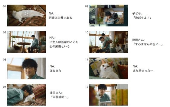 リモートワークで働く父親を声優・俳優の津田健次郎さんが演じます。育児や仕事で、ついつい自分のことは後回しになってしまう日常を、飼い猫の視点で描いています。「からだの栄養」であるカロリーメイト リキッドと、「こころの栄養」である愛猫、毎日に欠かせない2つの栄養のユニークな表現にも注目です。主人公を見守る飼い猫の声は、津田さんの‟大先輩”にあたる、様々な人気キャラクターを演じてきた井上和彦さんが担当。CMを見ている私たちまで癒される、猫の愛くるしい様子と井上さんの声もお楽しみください。