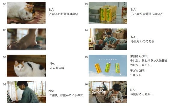 本CMは、主人公とともに暮らす猫の視点で展開します。「吾輩は栄養である」と語り始めた猫は、自宅で働く飼い主を眺めています。ふと猫の方を向いた主人公は、「え~よ~ほきゅう~」と一息つきながら、猫とたわむれます。自身を癒そうとする主人公に、猫は「無理もない」となにか理解した様子です。猫に癒された後、また打ち合わせに戻っていく主人公。そのとき、猫の目の前に「ドーン」と巨大な足があらわれます。そう、その足はその家に住む「怪獣」こと、元気いっぱいの子どもです。仕事をしている父親にしびれを切らし、「つまんなーい!」と父親にちょっかいを出します。父親は慌てた様子で子どもをなだめながら、会議の相手にも謝りますが、猫は「またはじまった…」と一言。この家ではよく見られる光景のようです。そんなバタバタな毎日の中で、主人公は冷蔵庫から冷えたカロリーメイト リキッドを取り出します。子どもの相手をしながら、ストローでカロリーメイト リキッドをごくごく。「栄養をとらないと、毎日もたない。」とからだの栄養補給をします。「からだ」と「こころ」の栄養、2つの栄養を上手に摂取しながら乗り切る主人公を描きます。