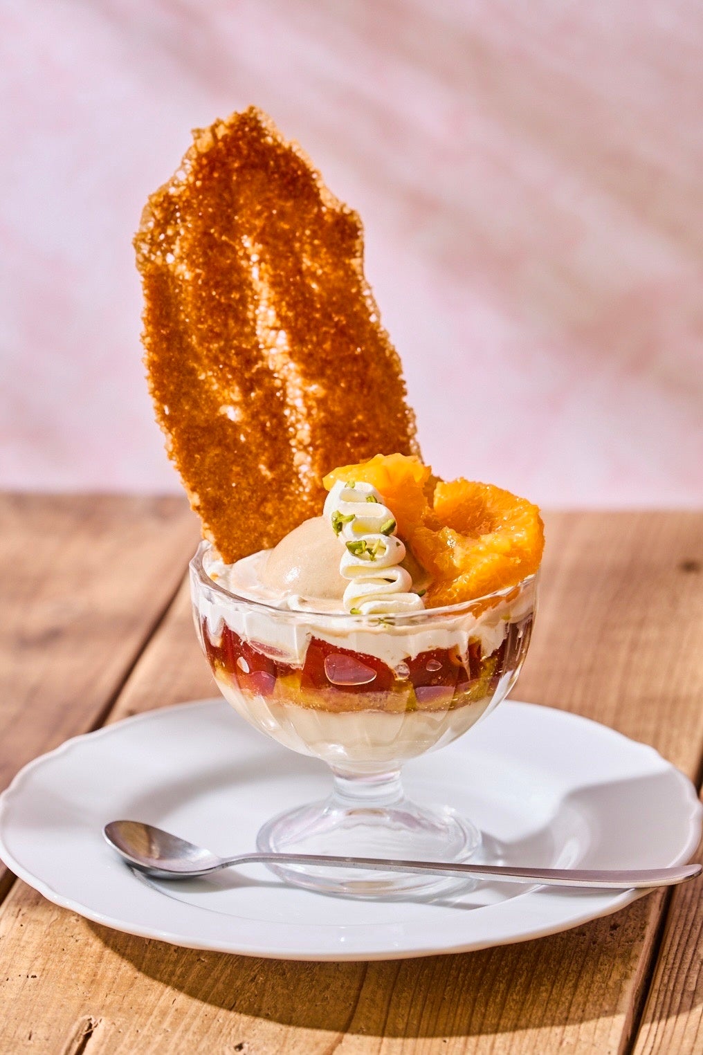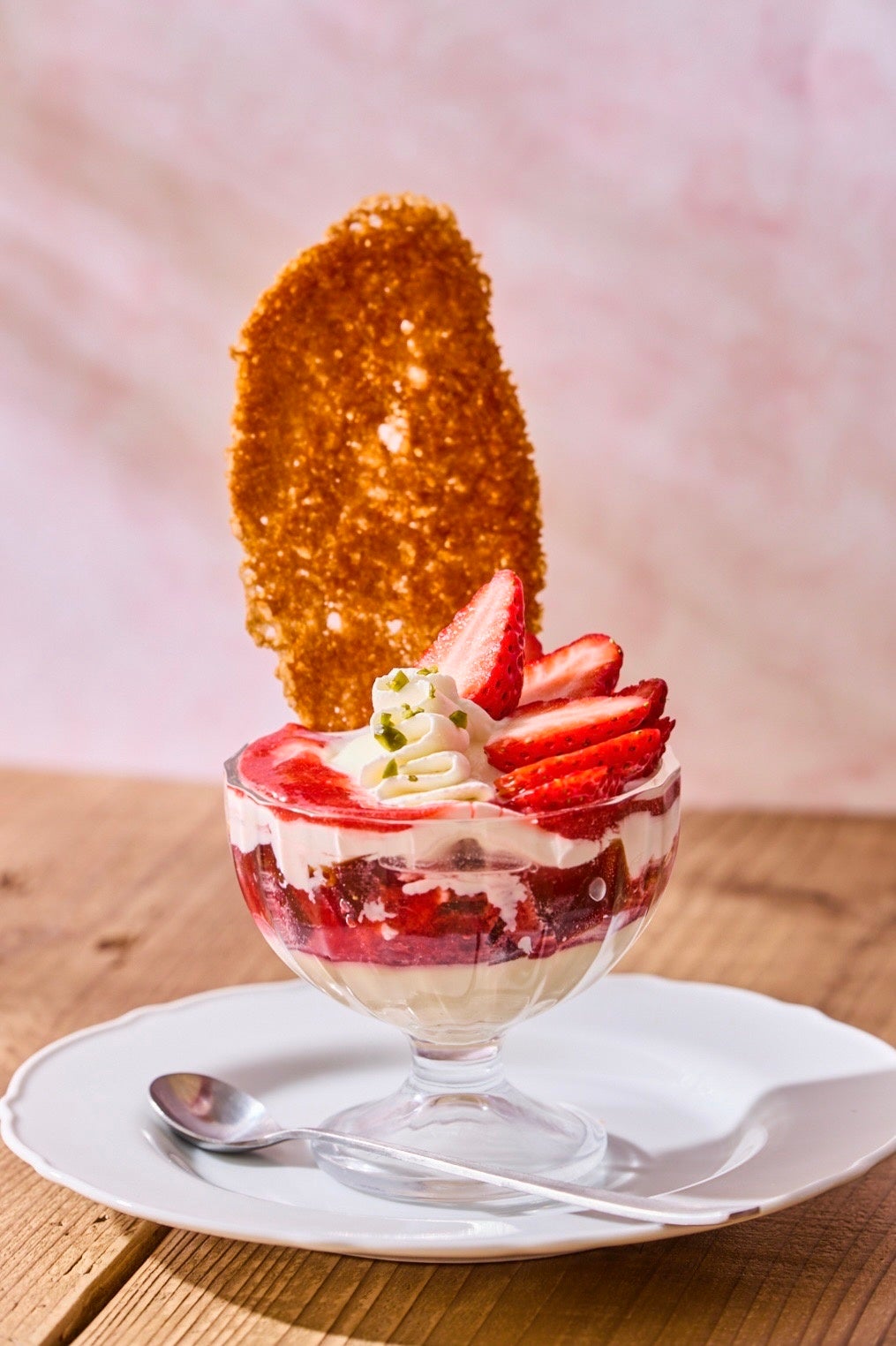 オリジナルブレンドティーのゼリーやブラマンジェに旬のフレッシュなストロベリー、甘酸っぱいアプリコットコンフィチュールやジャージーミルクジェラートを合わせた季節限定のティーパフェです。サクサクの自家製チュイールがアクセント。