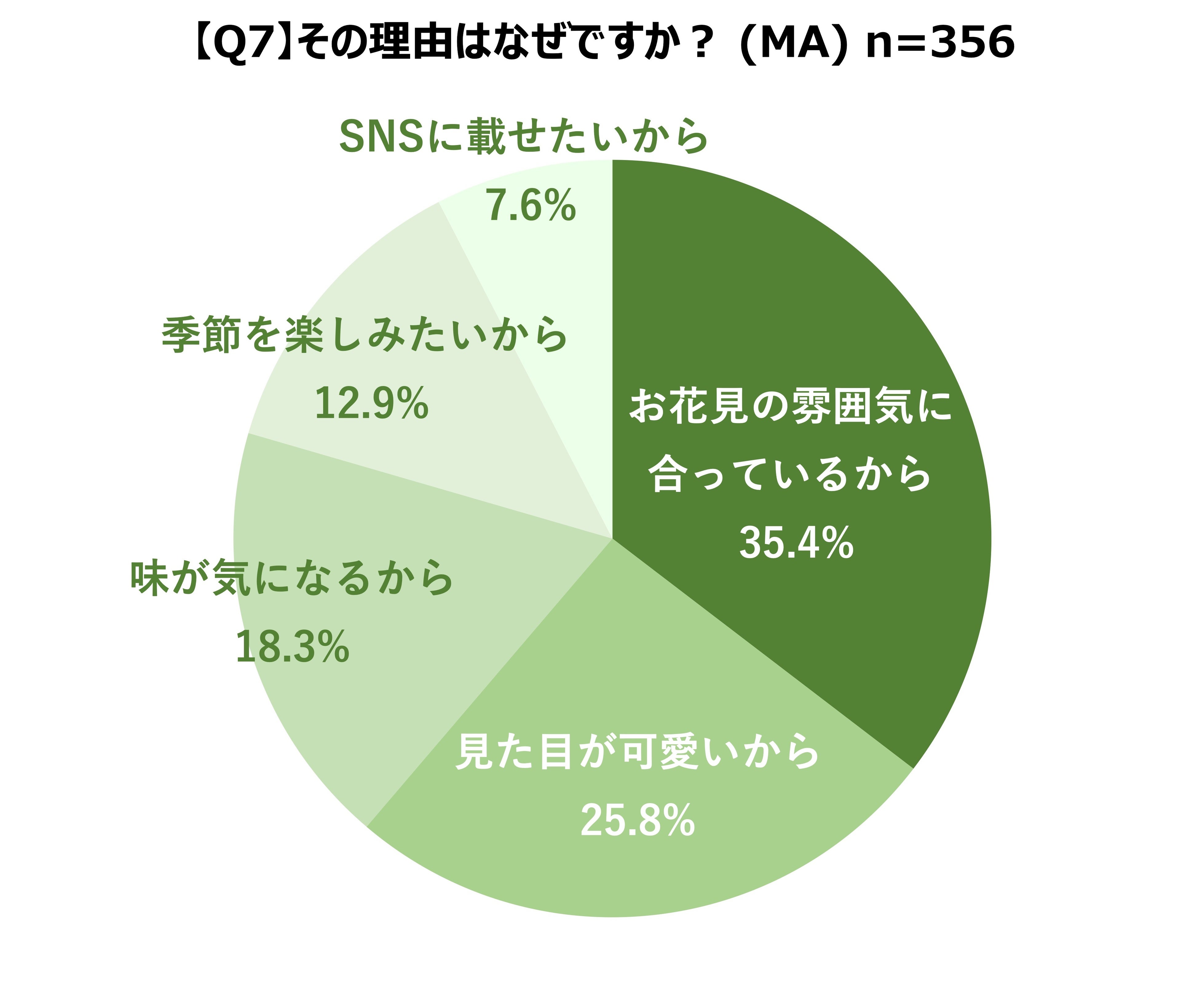 購入意向がある人(356名)にその理由を尋ねたところ、最も多い回答が35.4%で「お花見の雰囲気に合っているから」。次に「見た目が可愛いから」の25.8%、「味が気になるから」の18.3%、「季節を楽しみたいから」12.9%となり、その他を除き、「SNS載せたいから」が7.6%で最も低い回答率になりました。