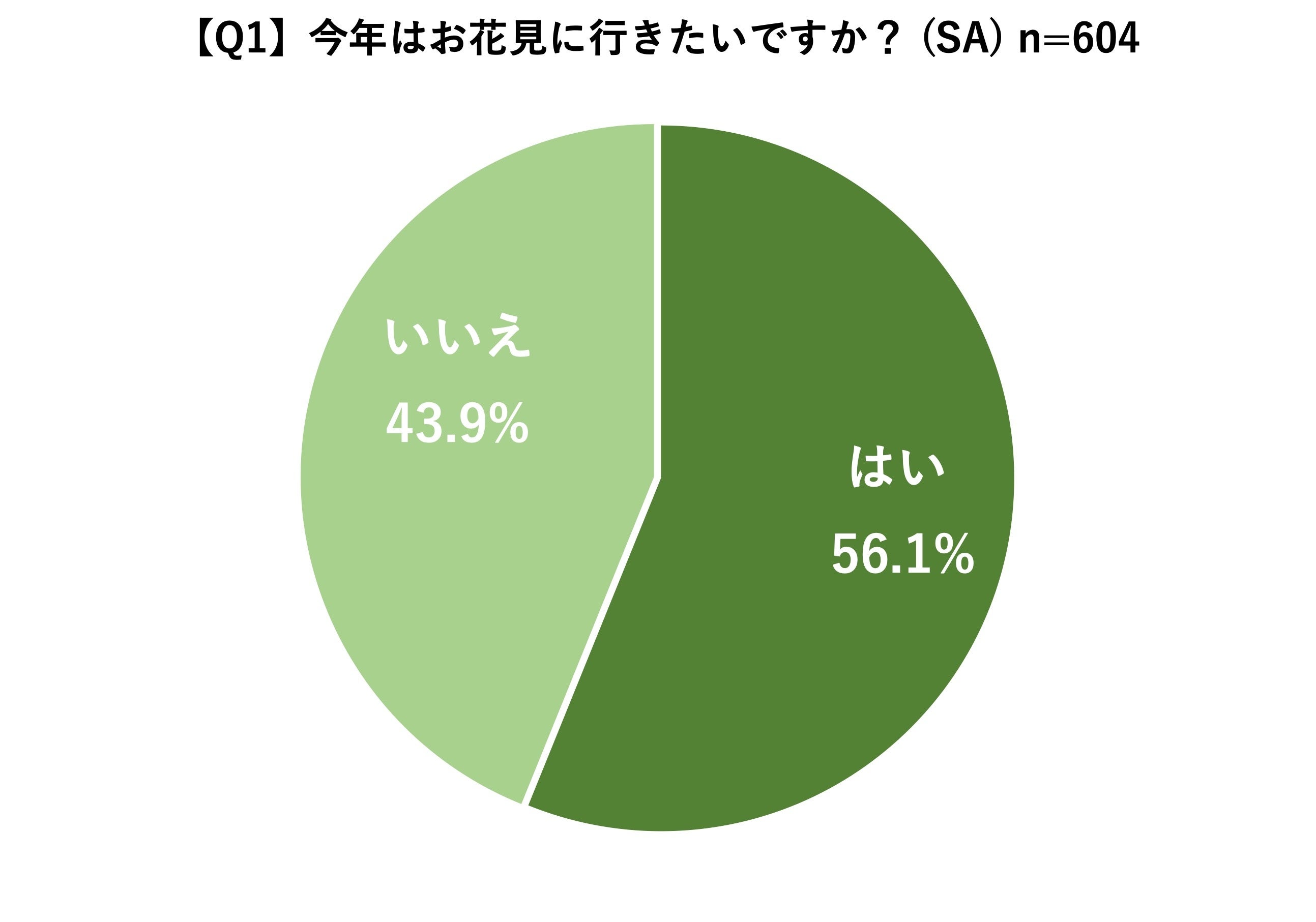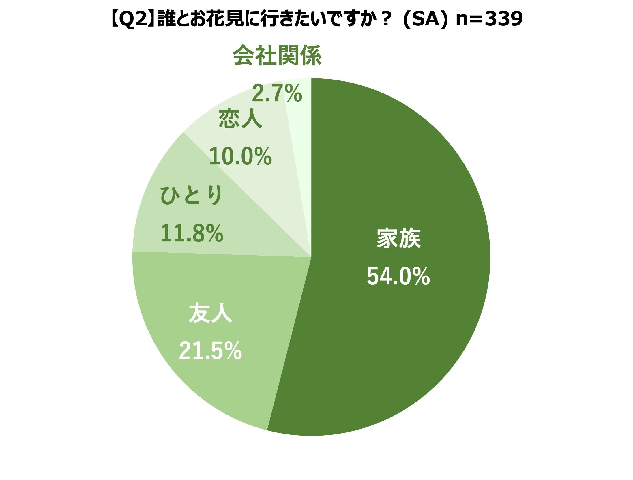 今年はお花見に行きたいかという質問に対し、「はい」が56.1%で、「いいえ」が43.9%となり、2人に1人が今年お花見に行きたいと回答しました。さらに「はい」と回答された方(339名)に誰とお花見に行きたいか聞いたところ、1位が54.0%で「家族」、2位が21.5%で「友人」、3位が11.8%で「ひとり」という結果になりました。春の行楽シーズンでは、家族との時間を優先する傾向が見られました。