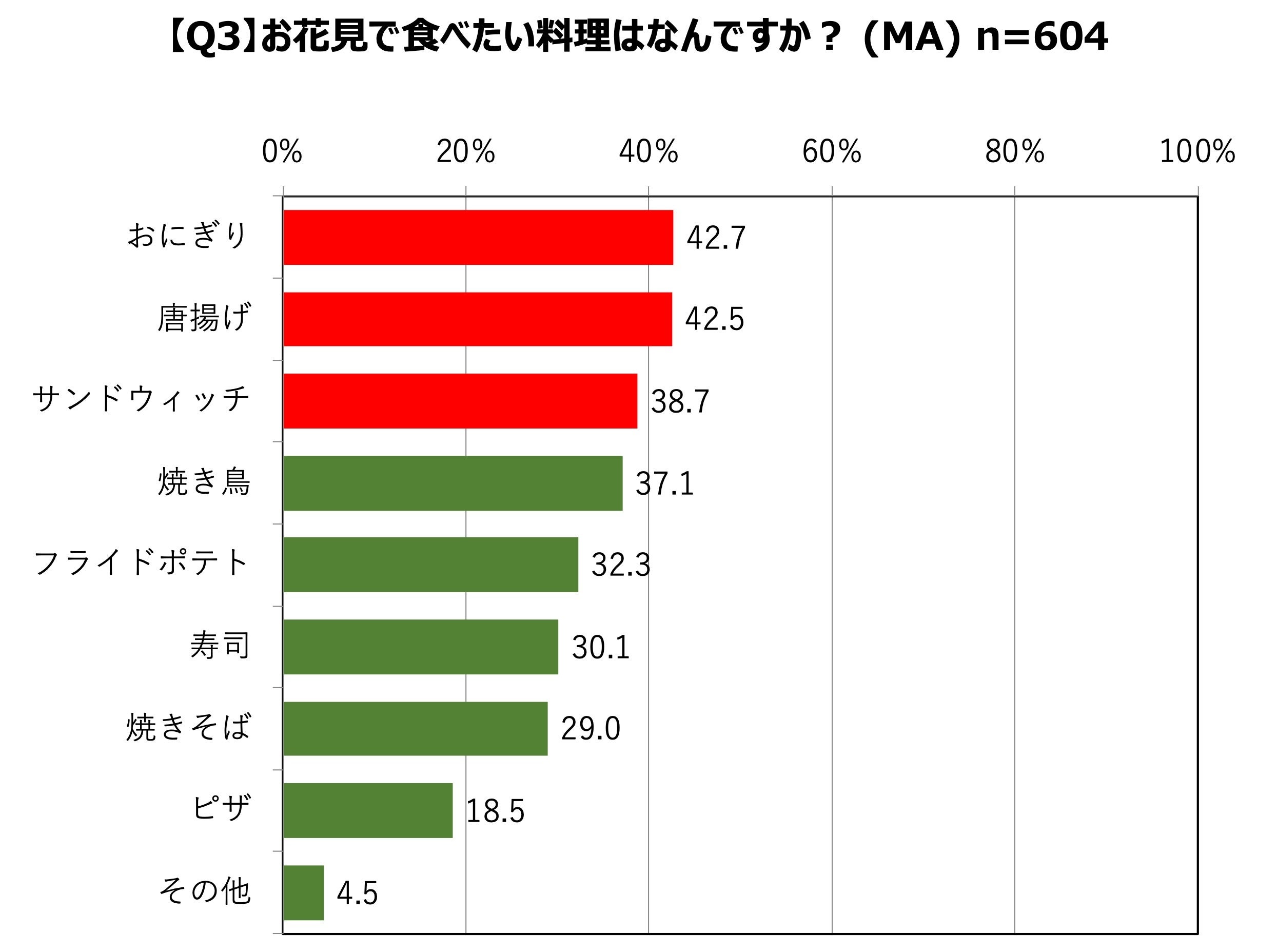 お花見で食べたい料理を聞いたところ、1位「おにぎり」42.7%、2位「唐揚げ」42.5%、3位「サンドイッチ」38.7%の結果になり、その後に「焼き鳥」37.1%、「フライドポテト」32.3%と続きました。