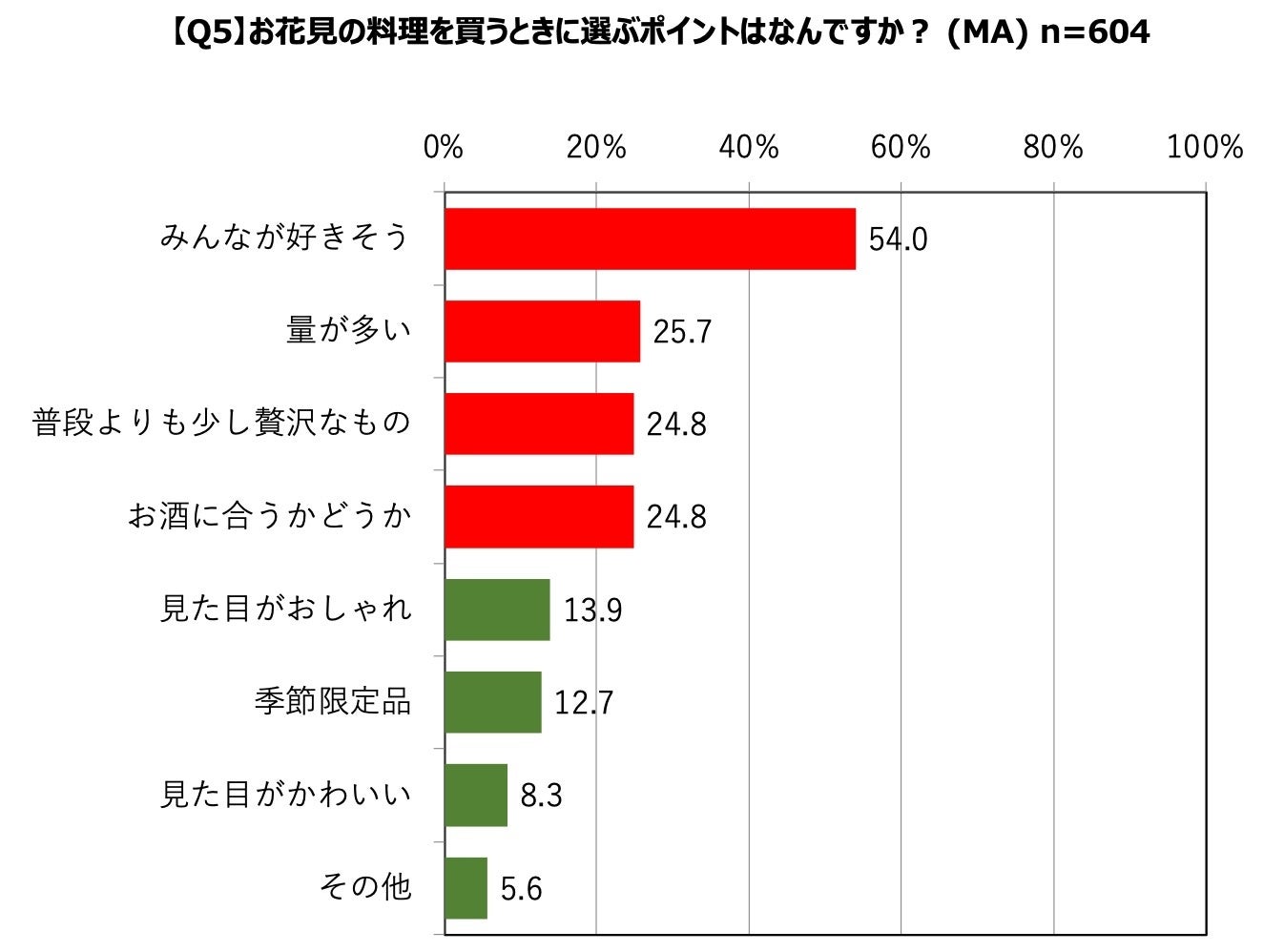 お花見の料理を買うときに選ぶポイントについて聞いたところ、1位「みんなが好きそう」54.0%、2位「量が多い」25.7%、同率3位で「普段よりも少し贅沢なもの」、「お酒に合うかどうか」が24.8%でした。
