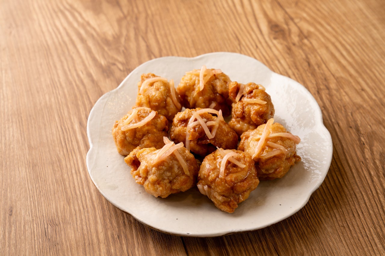 森林どりの唐揚げに岩下の新生姜と出汁の効いたあんをかけた、新生姜の食感と出汁の風味、しっかりした旨みを感じられる唐揚げです。