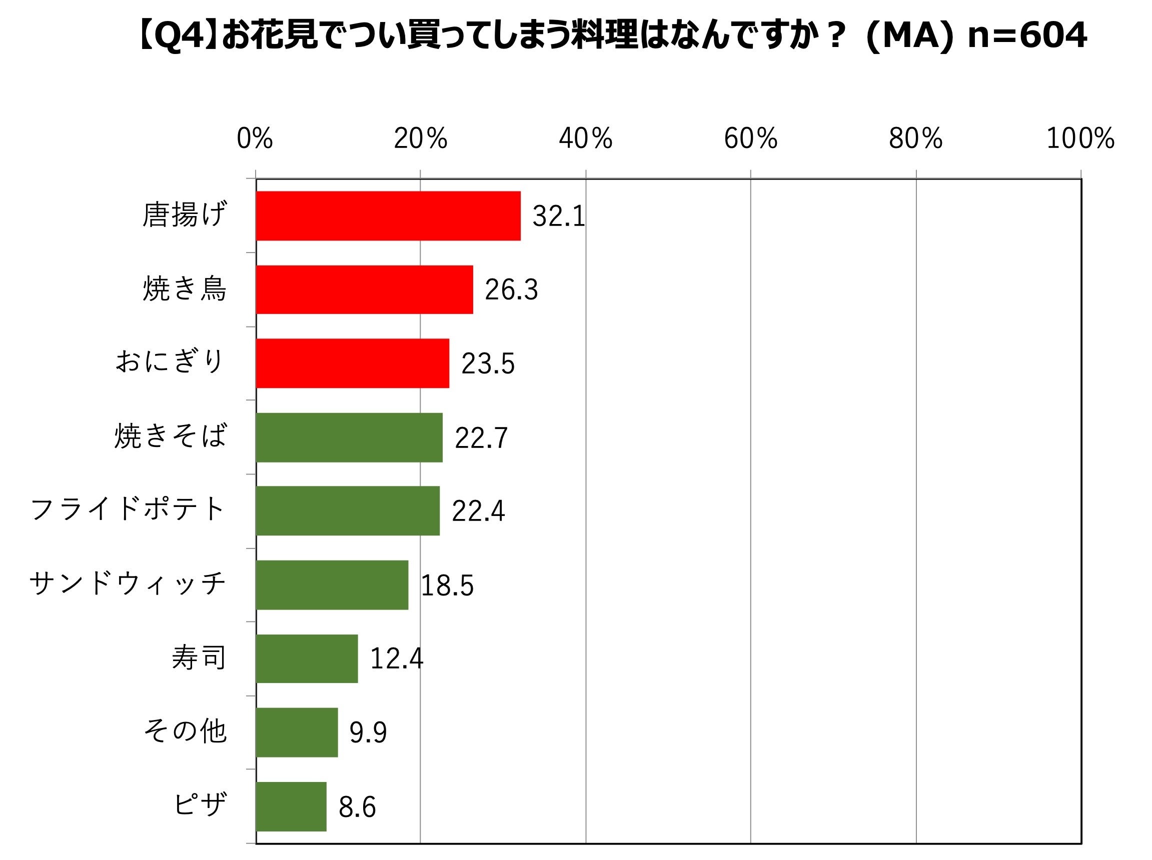 またお花見でつい買ってしまう料理について尋ねたところ、1位「唐揚げ」32.1%、2位「焼き鳥」26.3%、3位「おにぎり」23.5%という結果になりました。ピクニックやお祭りなどレジャーシーンでの定番料理が人気の傾向が見られました。
