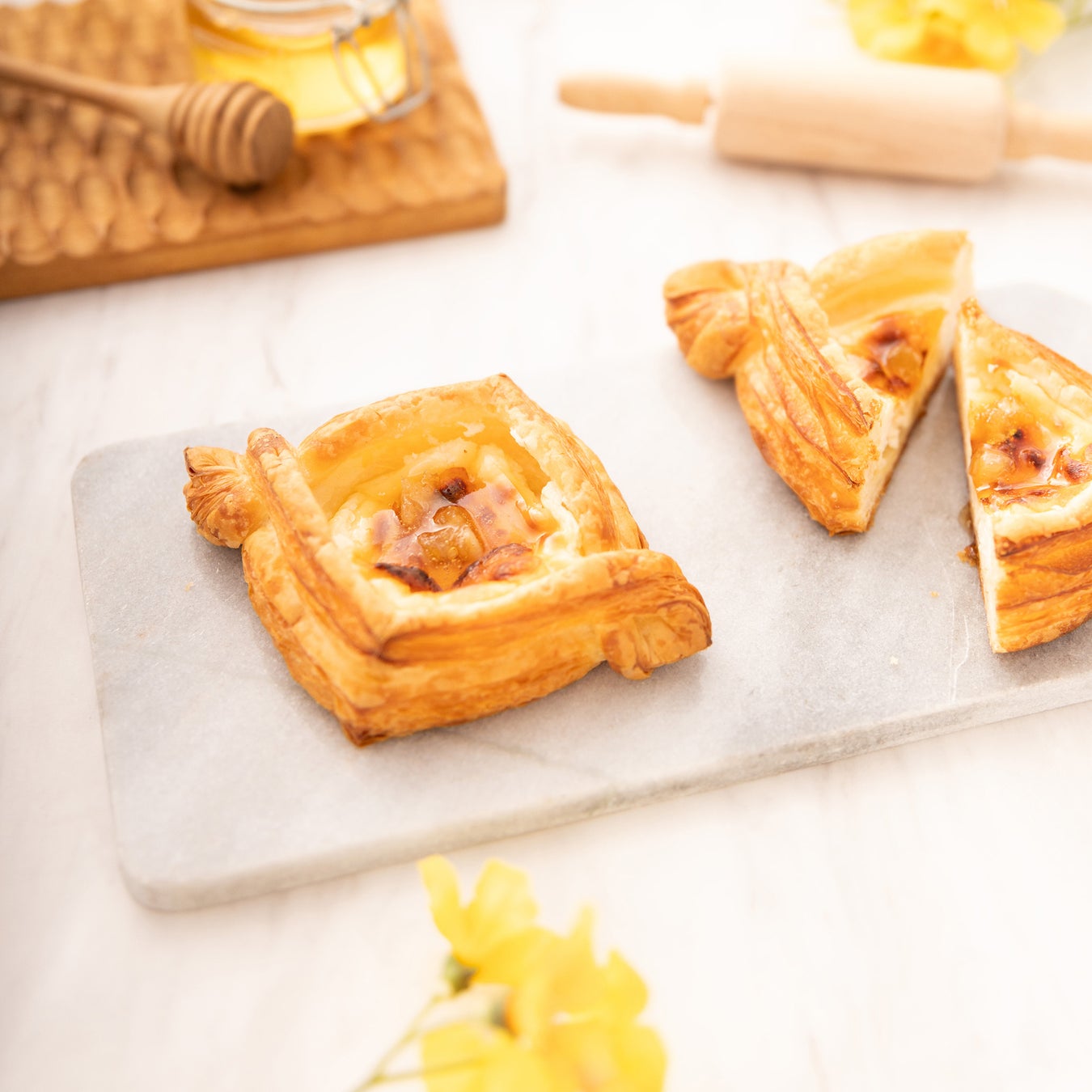 デニッシュにモッツァレラとはちみつ入りクリームチーズを絞り、瀬戸内レモンで爽やかさをプラスしたはちみつを注ぎました。