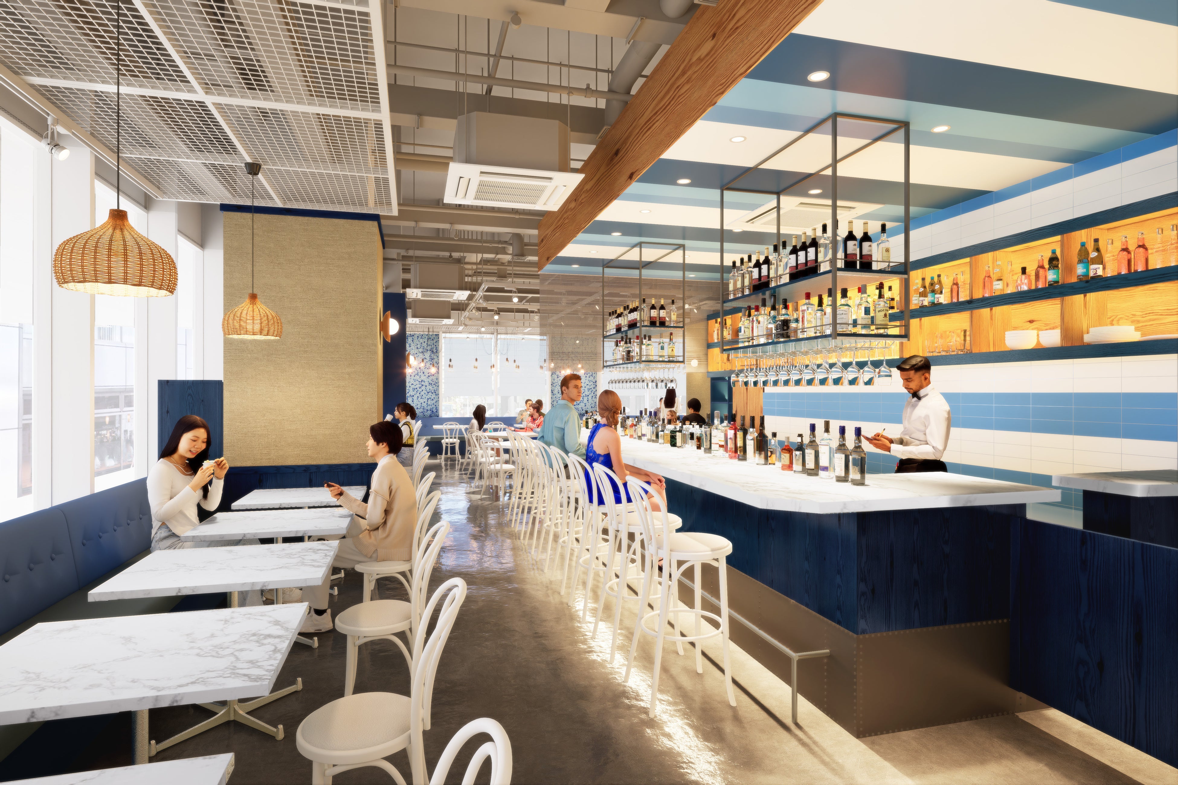 インテリアは海辺にある本店を彷彿させるブルーを貴重に、大理石のテーブルを使用。