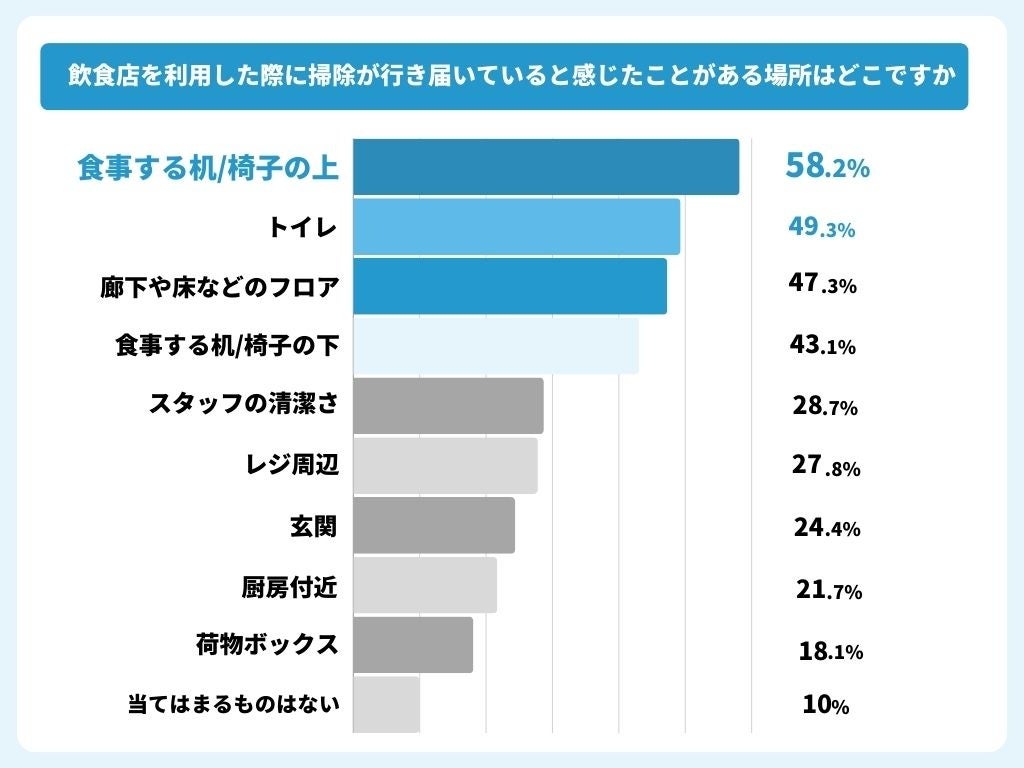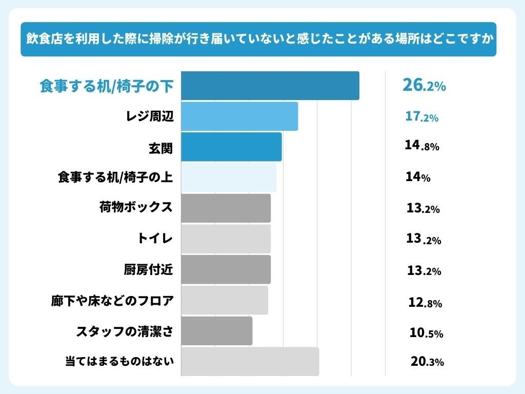一方で、清掃が行き届いていないと感じたことがある場所についての質問では、「食事する机/椅子の下」26.2%が最も多い回答を集めました。机の下は目に付きにくく、掃除が手薄になりがちな場所のようです。さらに、「レジ周辺」17.2%、「玄関」14.8%など、比較的人の動線上にある場所が気になる傾向にあることもわかります。