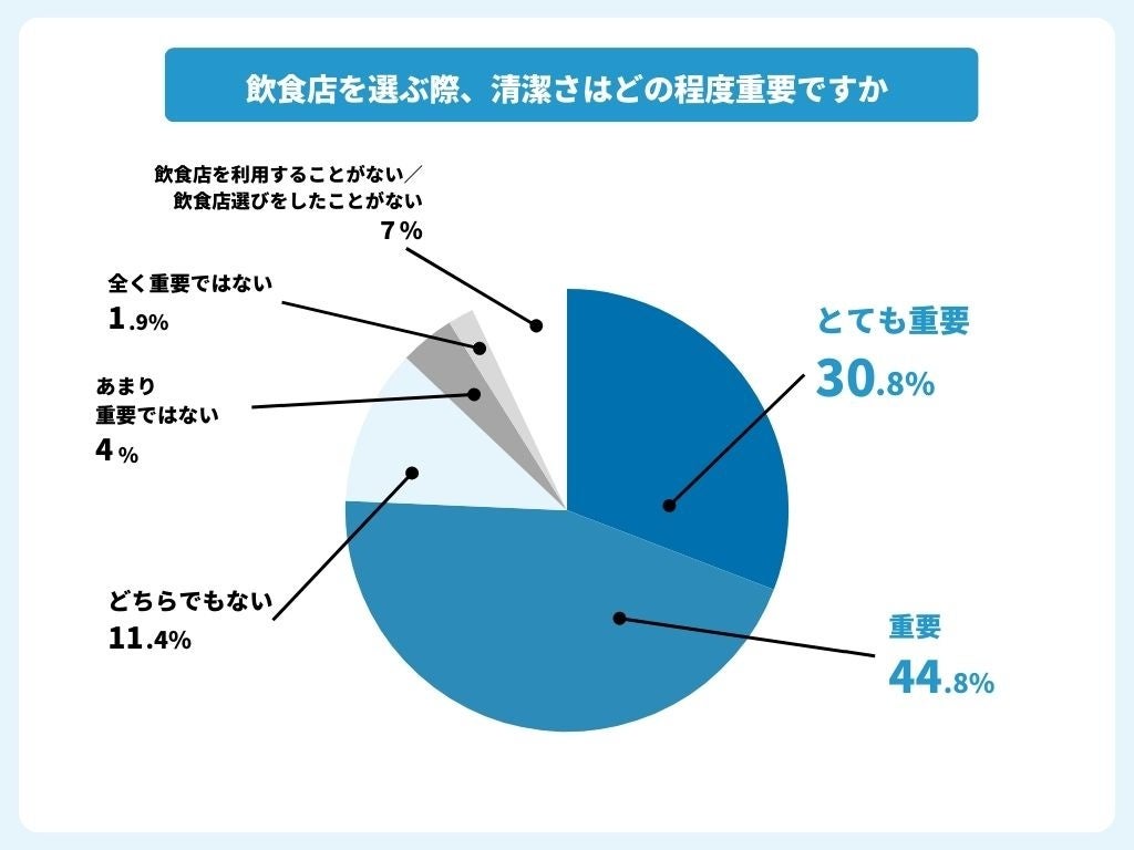 まずは飲食店を選ぶ際にどの程度店内の清潔さを重視しているか尋ねました。結果、「とても重要/重要」の合計は75.6%にのぼりました。飲食店選びは価格や味、立地なども合わせて考慮されるものの、店内の清潔さは重要な要素となることがわかります。