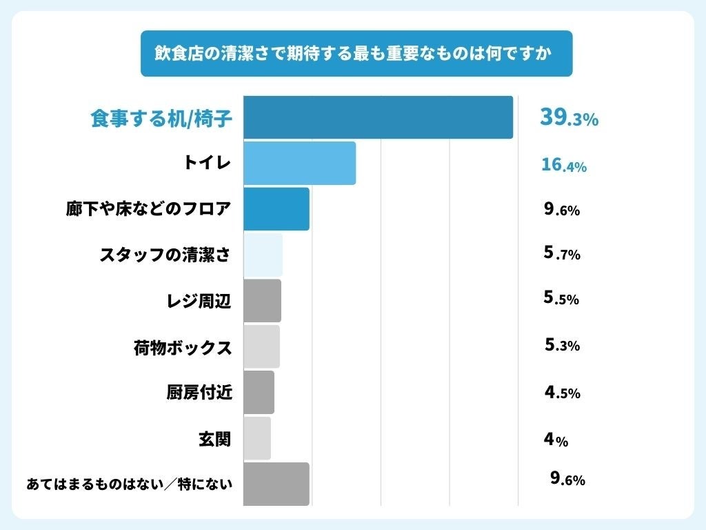 そこで、清潔さで期待するものとして最も重視することを聞きました。結果、最も回答が多かったのは「食事をする机、椅子」39.3%となりました。顧客が最も重視しているのは食事スペースをはじめとする店内の衛生状態で、見えづらい場所の清潔さについてはやや関心が低い傾向にあります。飲食店運営者としては、お客様の目線に立った重点的な清掃が求められていると言えそうです。