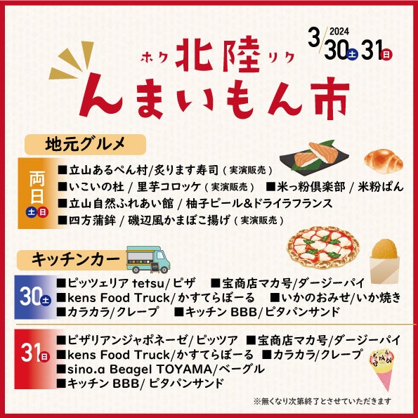両日、地元企業のおいしいものや、富山・石川からキッチンカーがささら屋立山本店に大集合します。ます寿司やクレープ、ピザやパンなどおなかいっぱいになること間違いなしです。
