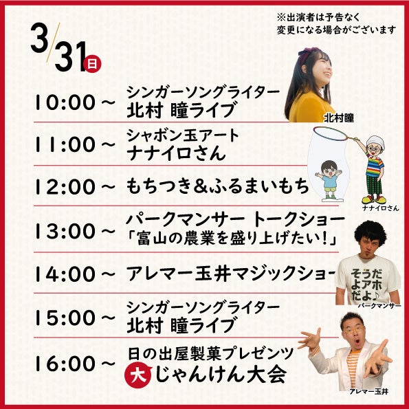 13:15頃・日の出屋製菓コーポレートソング、高原兄の「パリッと!日の出屋製菓」を生披露を予定。